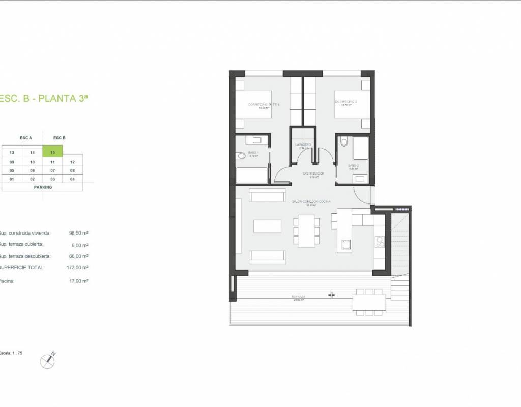 Desde los apartamentos se tiene acceso directo a grandes terrazas en el mismo nivel que el apartamento. Además, hay una escalera que lleva al solarium, donde cada apartamento de la planta superior tiene una piscina privada, un aseo, una cocina al aire libre con un pequeño ascensor desde la cocina de abajo y mucho más.