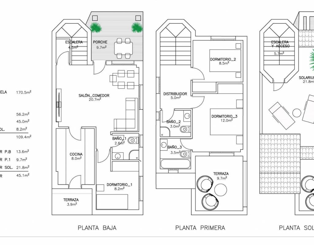 Las viviendas constan de 3 dormitorios, 3 baños, salón-comedor y cocina independiente, 2 terrazas en planta baja, una terraza en la 2ª planta y un solarium en la azotea.