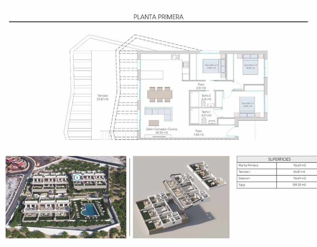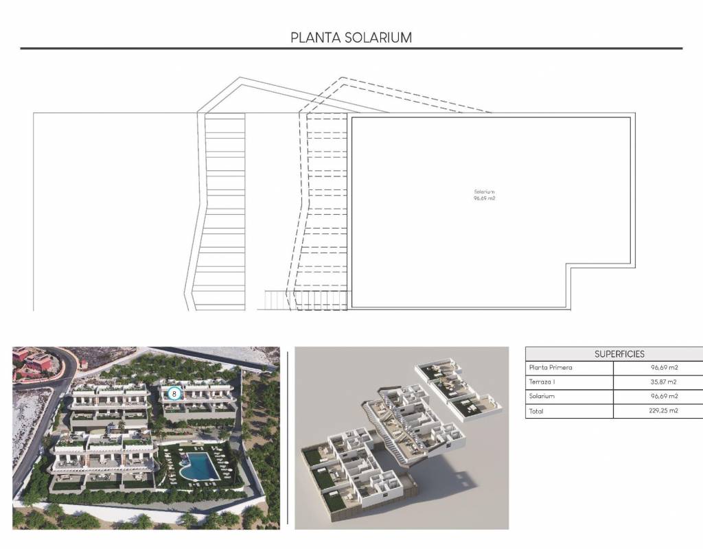 Bungalows en planta alta con solarium privado y bungalows en planta baja con jardín privado y posibilidad de piscina privada con coste adicional.