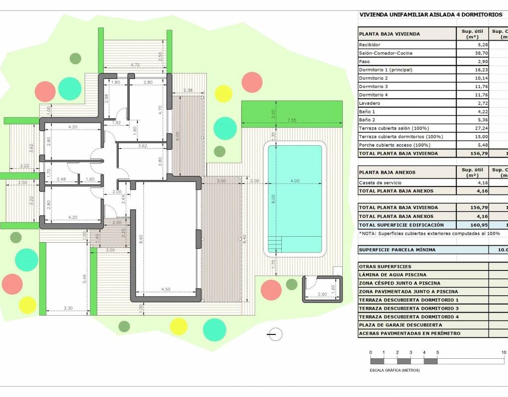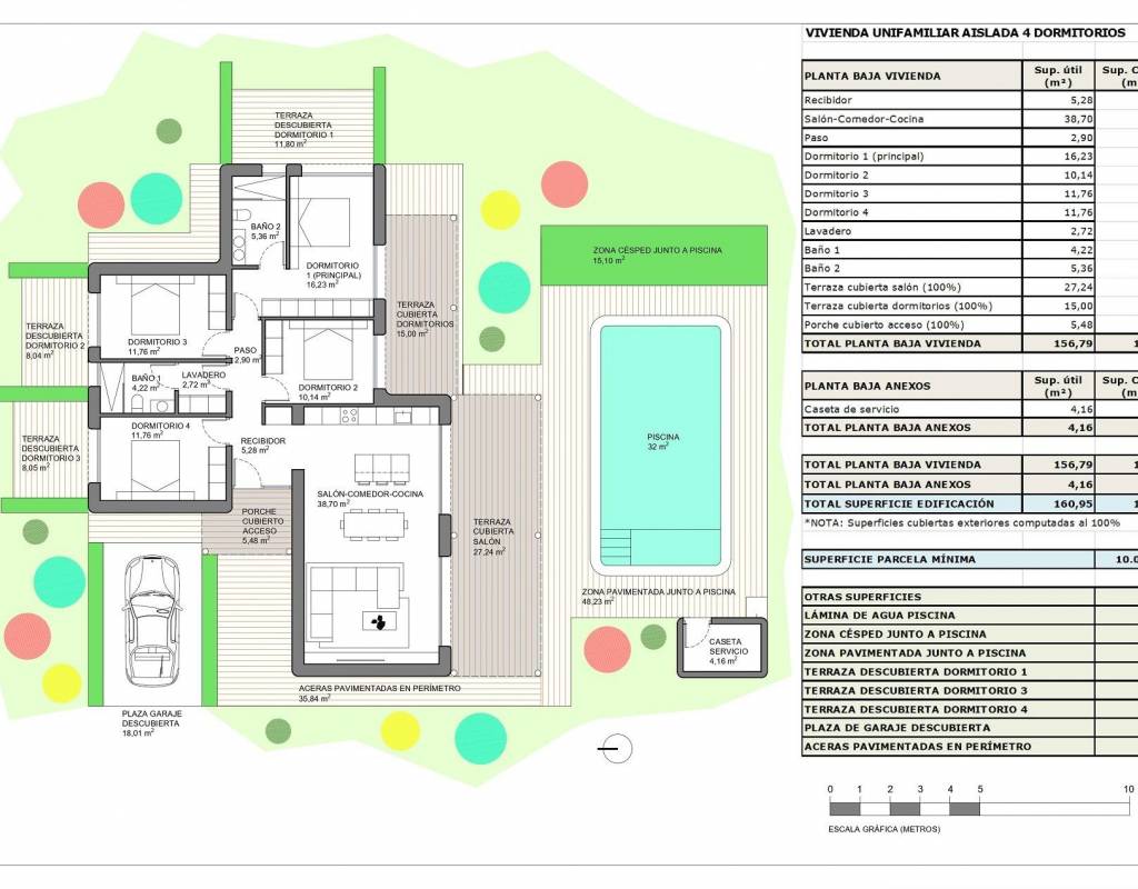 Cada propiedad se encuentra en una zona vallada de aproximadamente 2500 m² dentro de una parcela rústica de 10 000 m², lo que garantiza una gran privacidad y espacio. Las villas incluyen una piscina privada de 8 x 4 m, un porche, un trastero y un aparcamiento exterior privado.