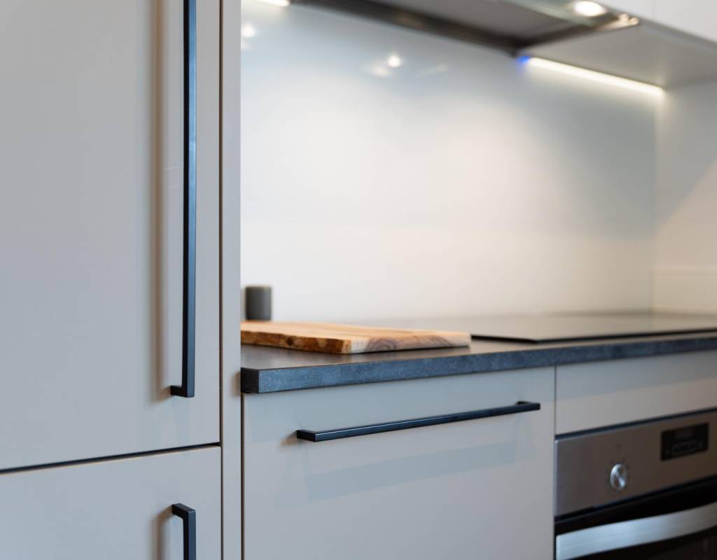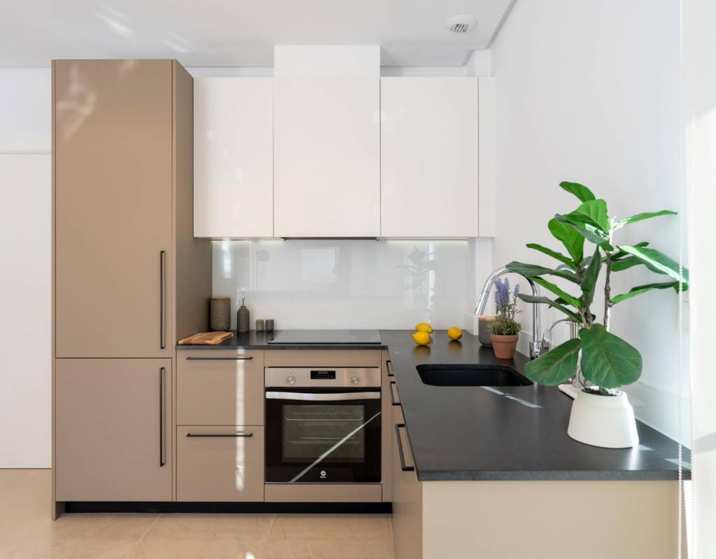Cocina totalmente equipada con placa de inducción, campana extractora, horno, frigorífico y preinstalación para lavavajillas
