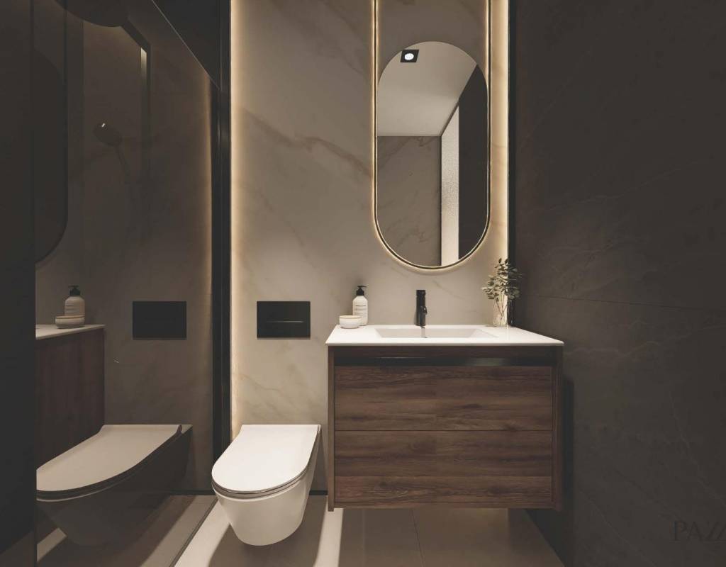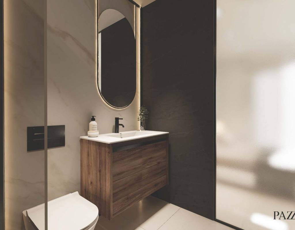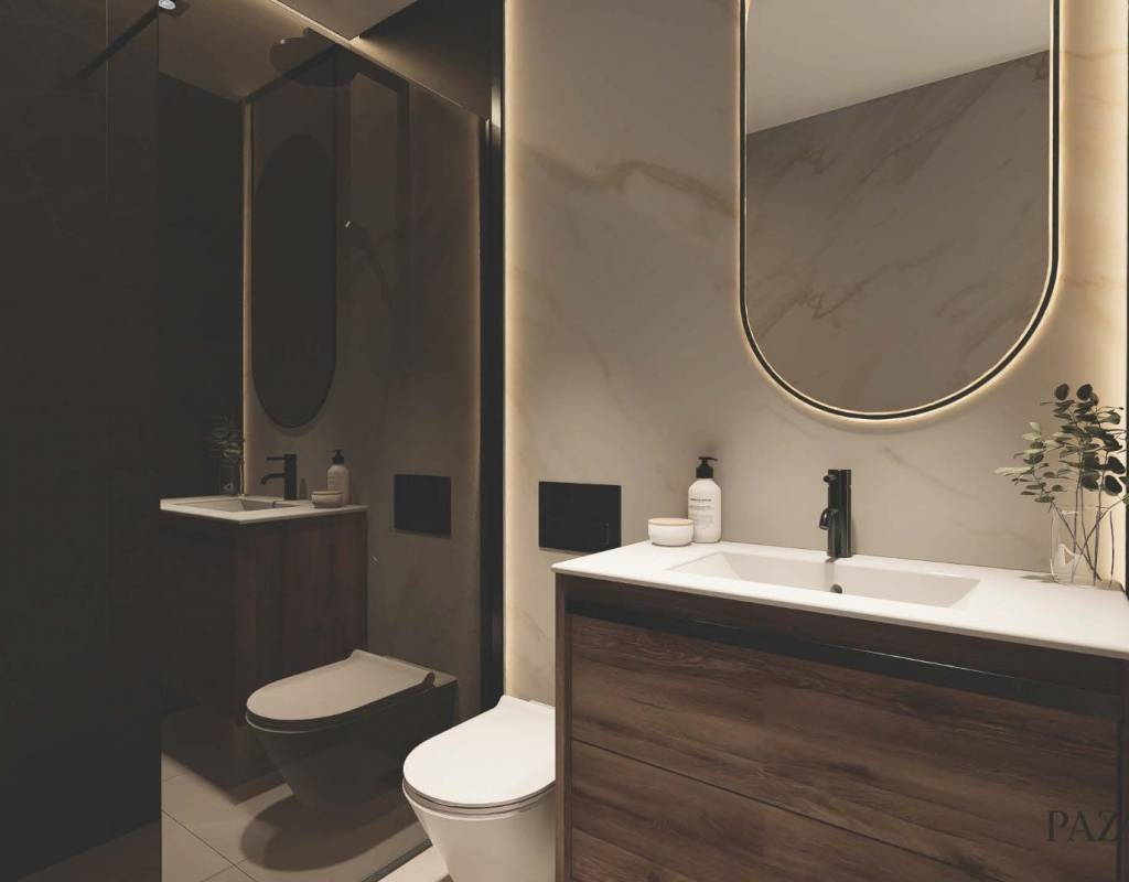Baños totalmente equipados con muebles y mamparas de ducha.