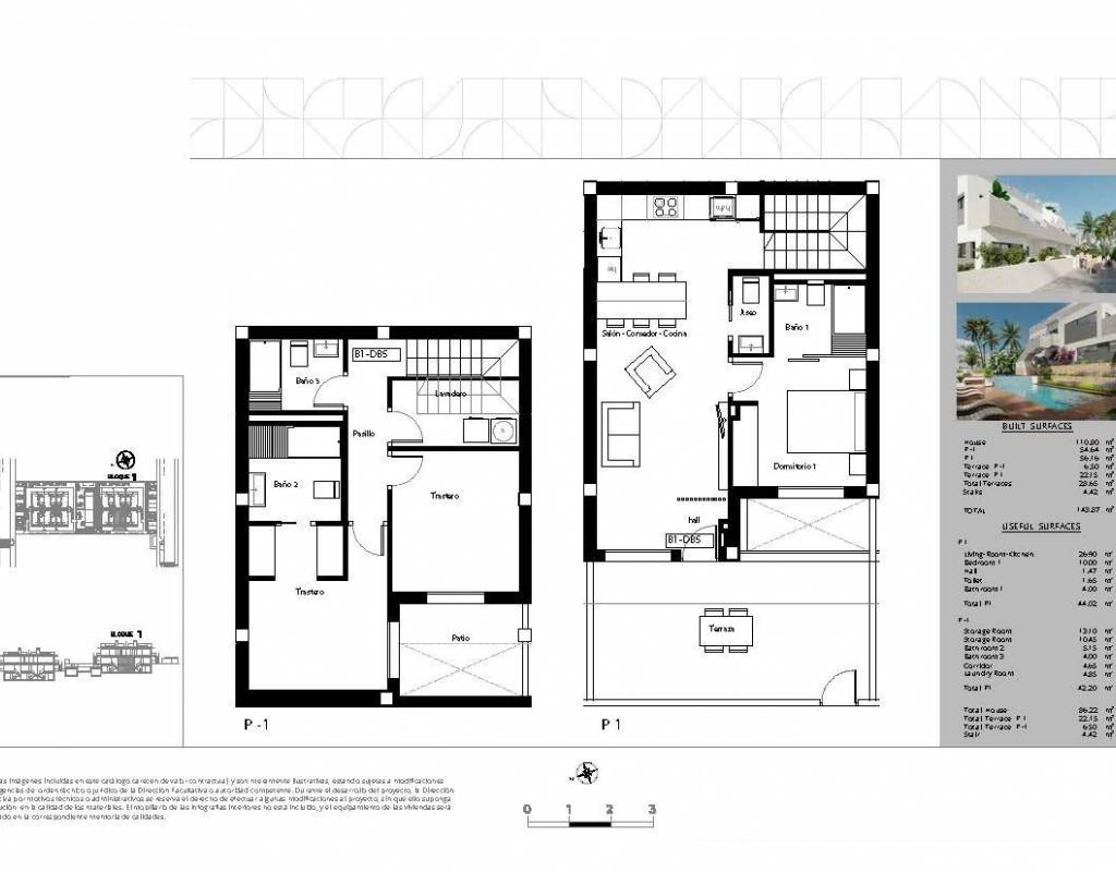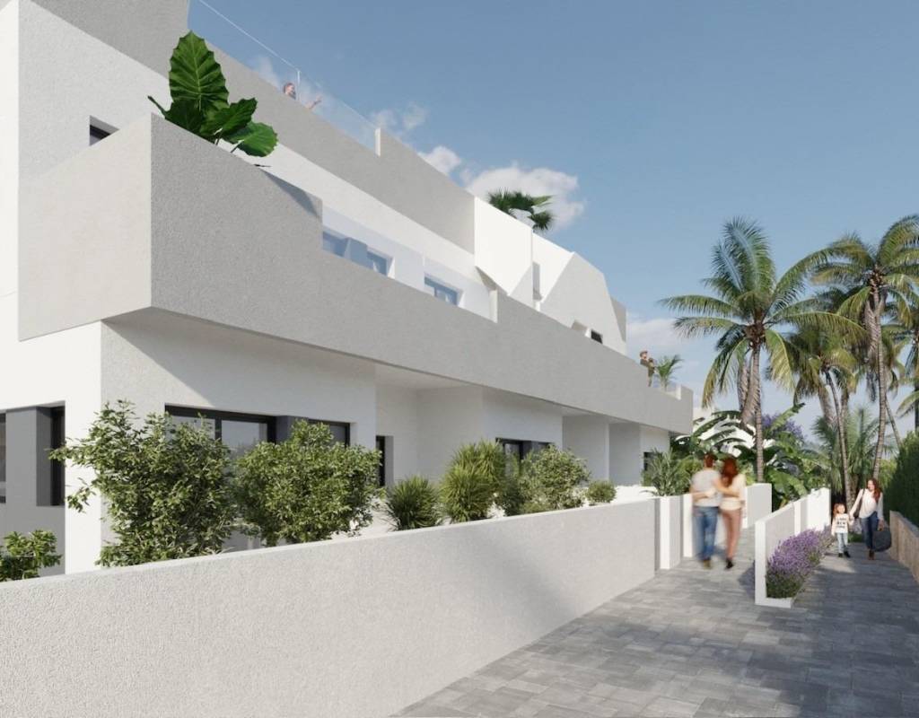 Bungalows en planta baja: 3 dormitorios y 3 baños, incluyendo un dormitorio principal con baño en suite en la planta principal, salón-comedor diáfano con cocina, aseo de invitados y amplia terraza. Una escalera conduce a la planta baja, con 2 dormitorios adicionales, 2 baños, lavadero y patio.