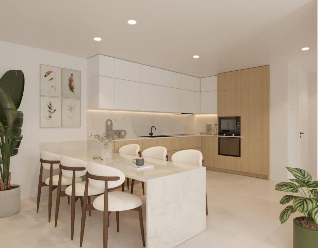 Bungalows en la planta superior: 2 dormitorios, 2 baños, cocina abierta con amplia zona de estar, terraza y solárium privado, perfecto para disfrutar del sol del Mediterráneo.