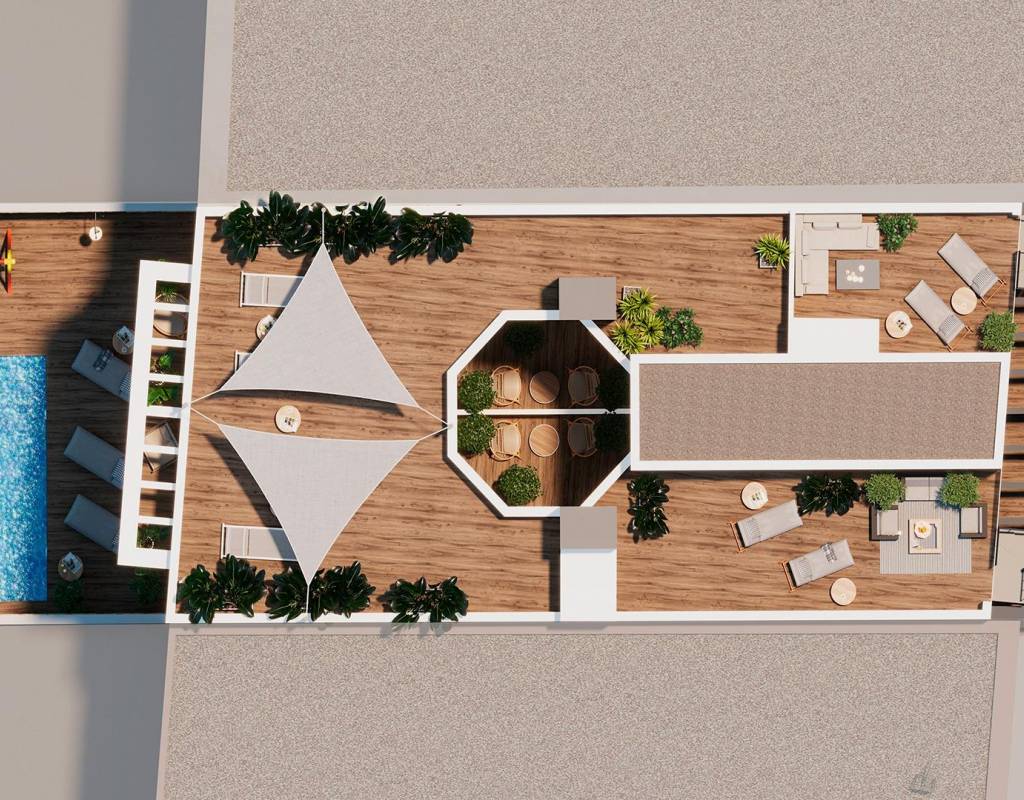Solárium en la azotea con zonas chill-out y exuberante vegetación