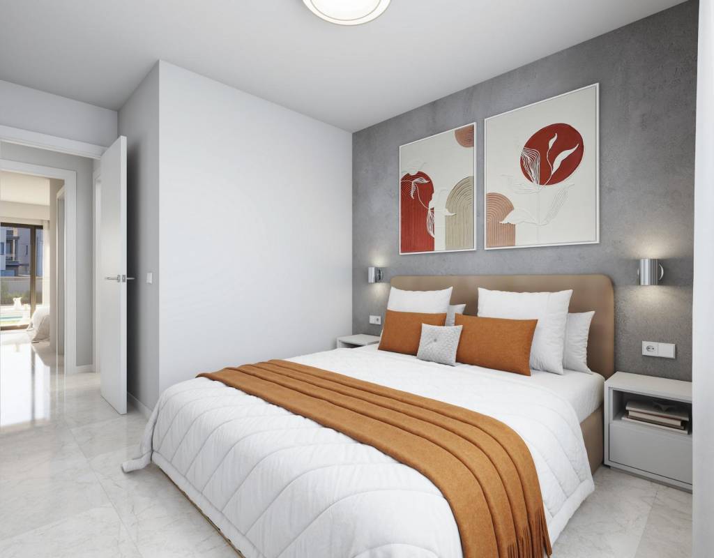 Viviendas en planta superior: 2 dormitorios y 2 baños con amplias terrazas y soláriums privados en la azotea, perfectos para tomar el sol y comer al aire libre.