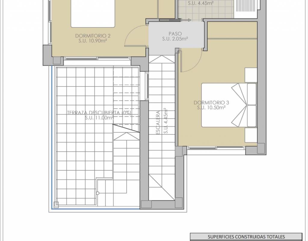 Cada villa está diseñada con una distribución contemporánea en dos plantas, con 3 dormitorios y 2 baños. La primera planta cuenta con una terraza descubierta y hay un solárium en la azotea disponible con un coste adicional.