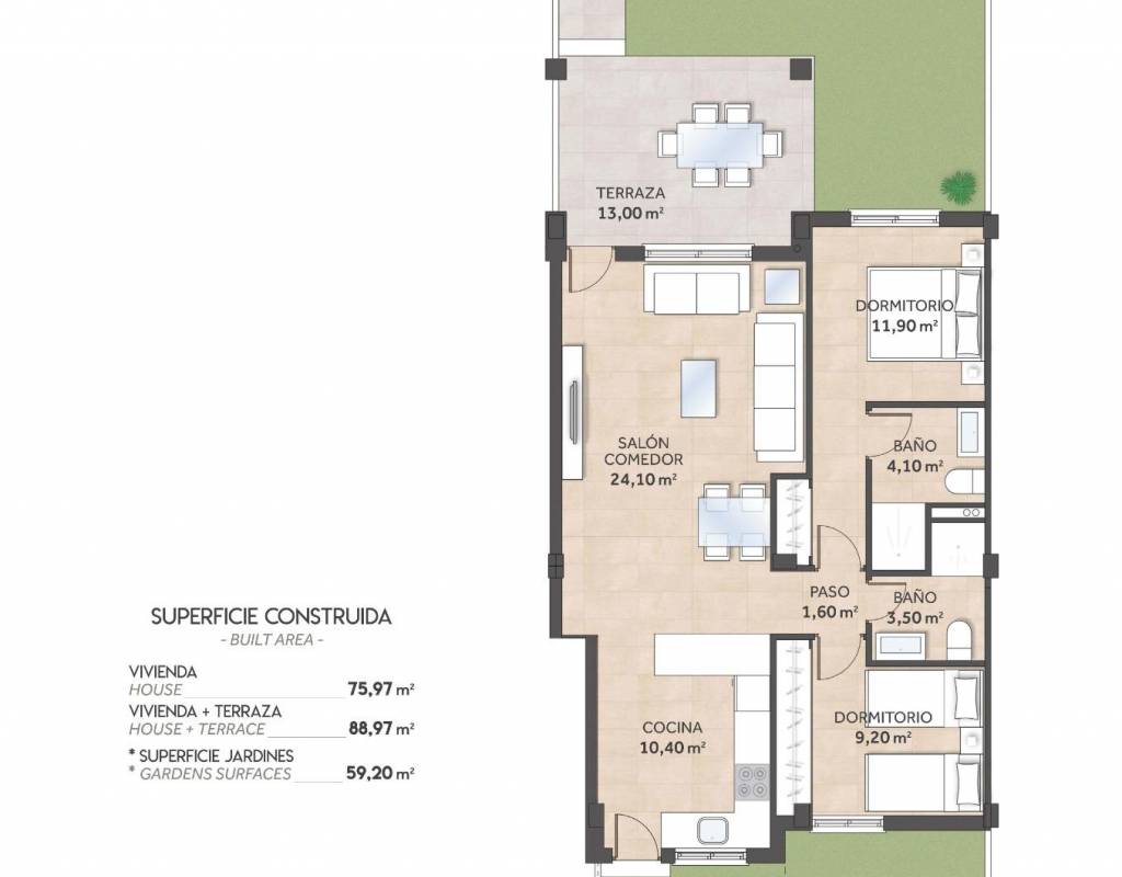 Bungalows en planta baja: 2 dormitorios, 2 baños, dos amplios jardines privados y aparcamiento en superficie.