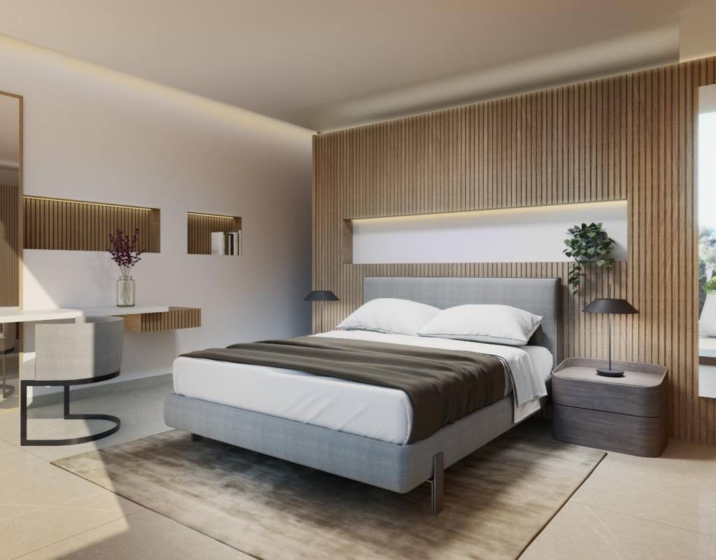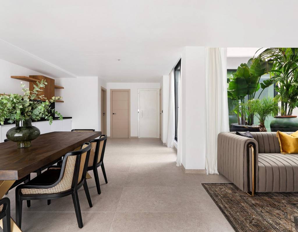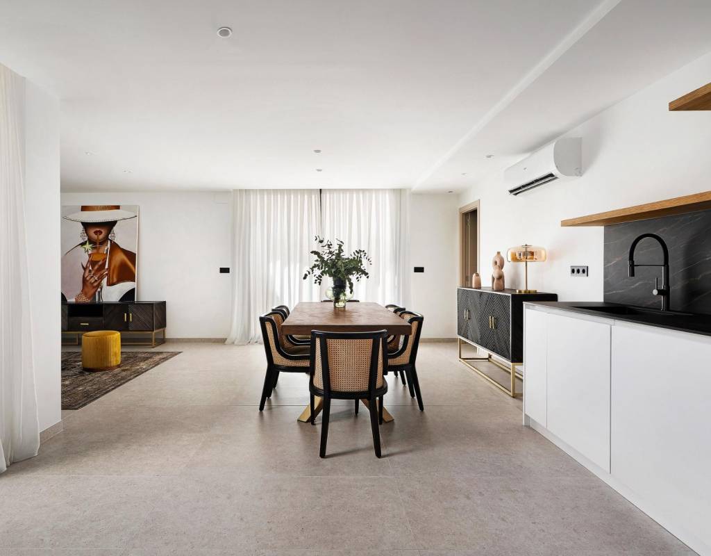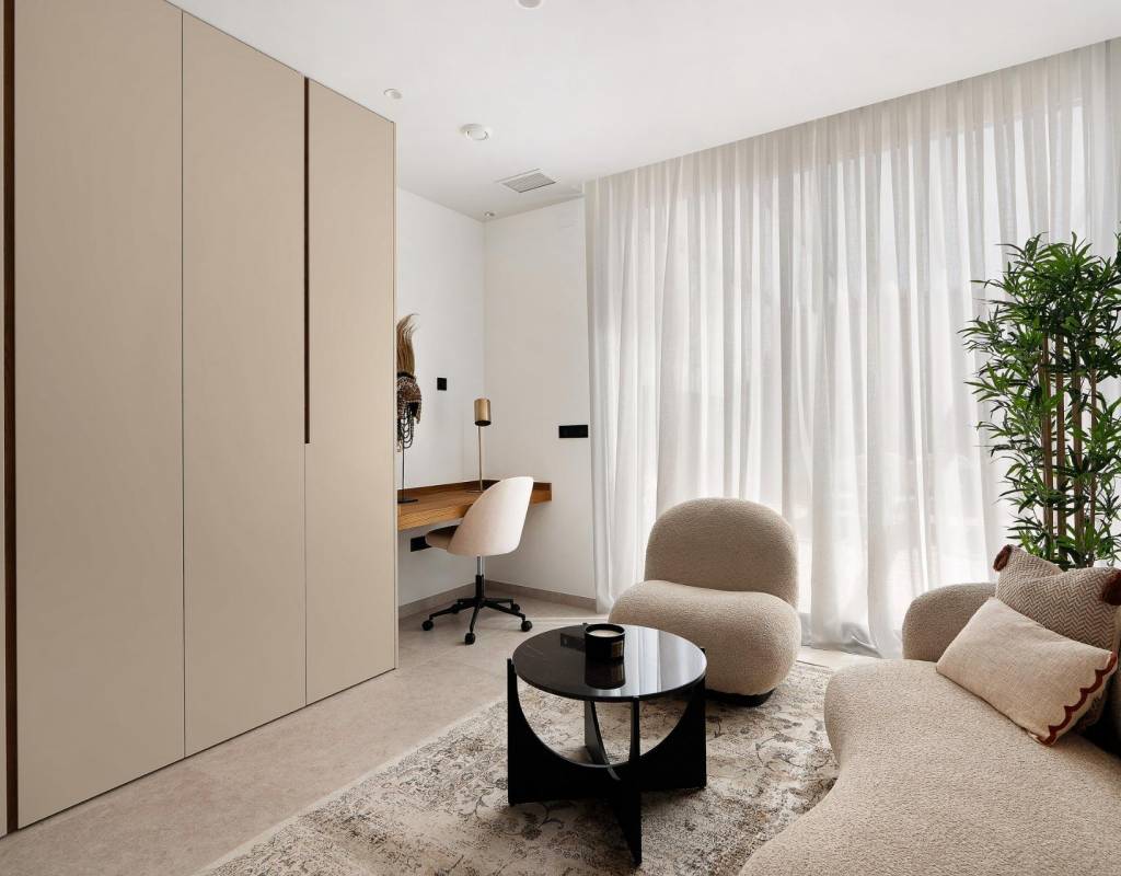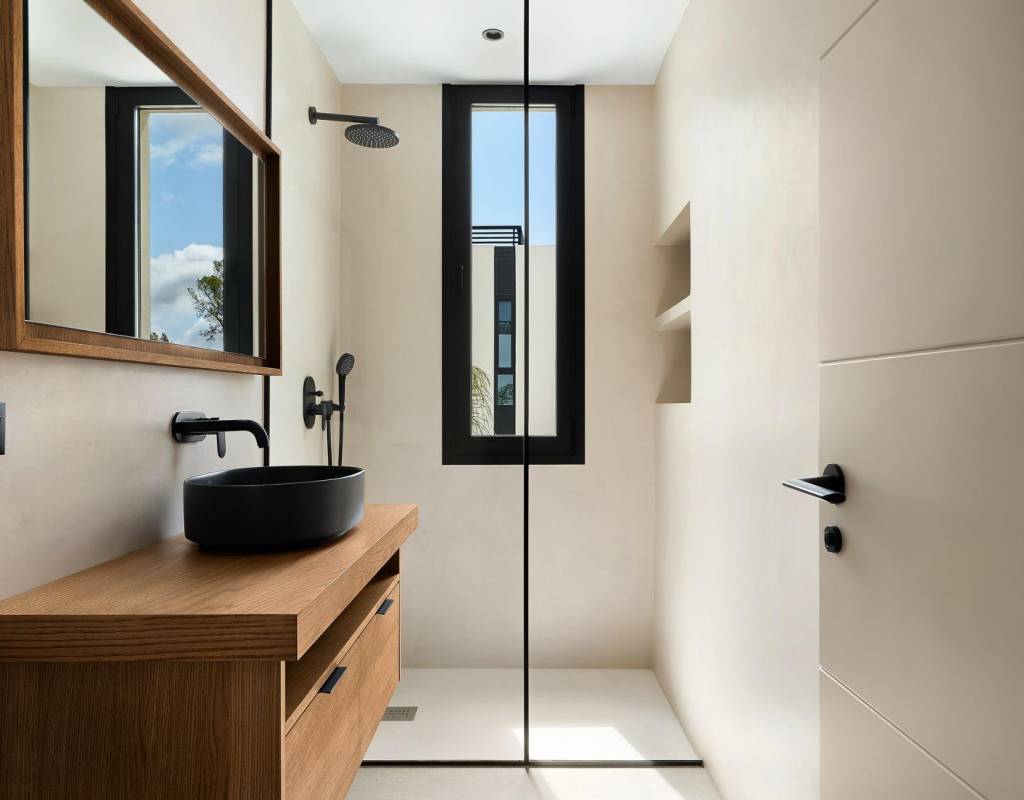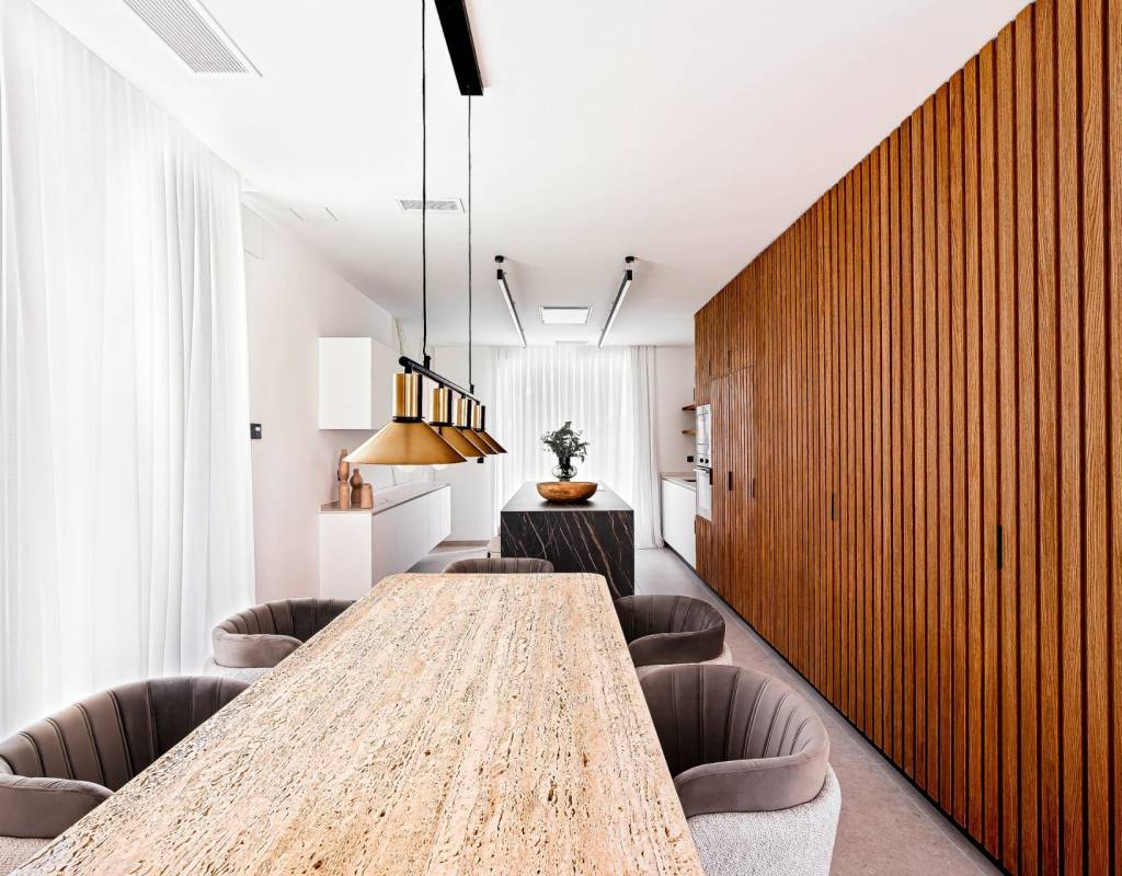 Estas villas están construidas en tres niveles: planta baja, planta superior y un semisótano con acceso independiente y un patio interior que proporciona luz natural y ventilación. Todas las viviendas cuentan con 4 o 5 dormitorios y 4 o 5 baños, un amplio salón-comedor diáfano, una cocina totalmente equipada con electrodomésticos Miele y una terraza cubierta con zona de barbacoa.