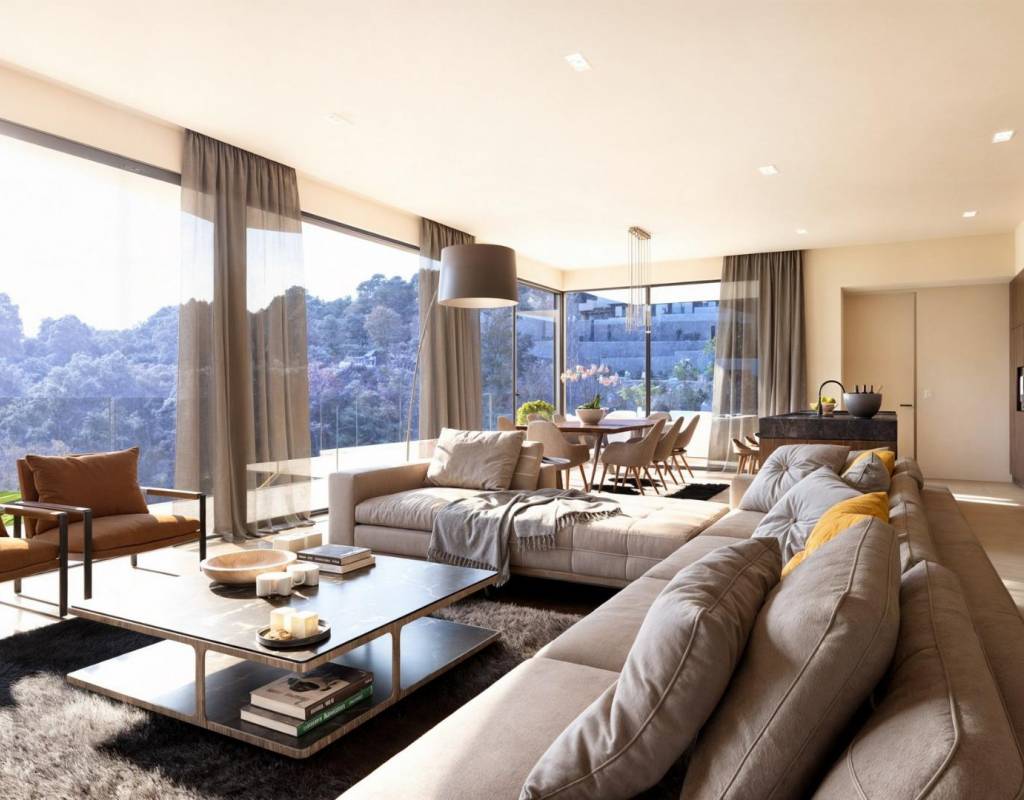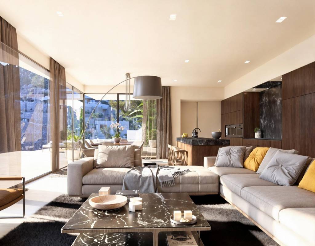 La sala de estar y el comedor de planta abierta se complementan con una cocina de diseño totalmente equipada con electrodomésticos de alta gama, ideal tanto para la vida cotidiana como para celebrar reuniones. Amplias terrazas rodean la propiedad, creando múltiples zonas de relax y entretenimiento al aire libre.