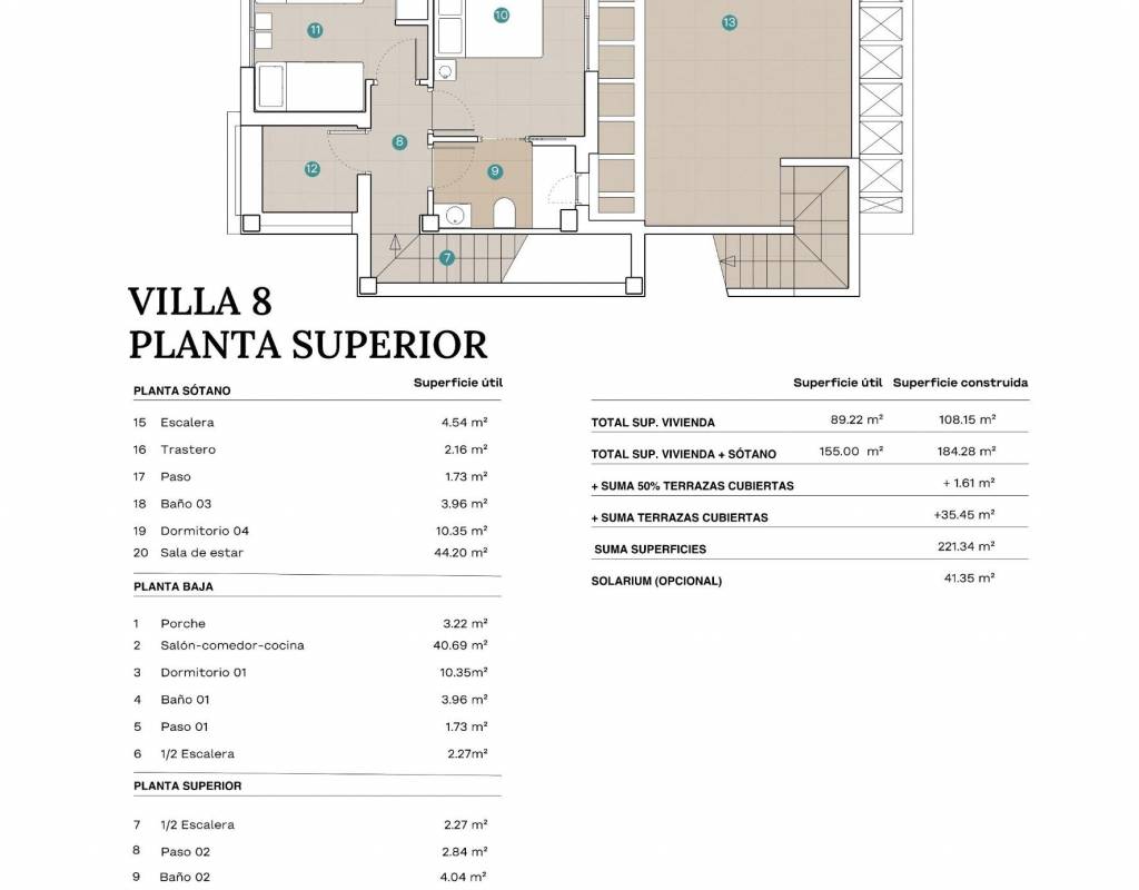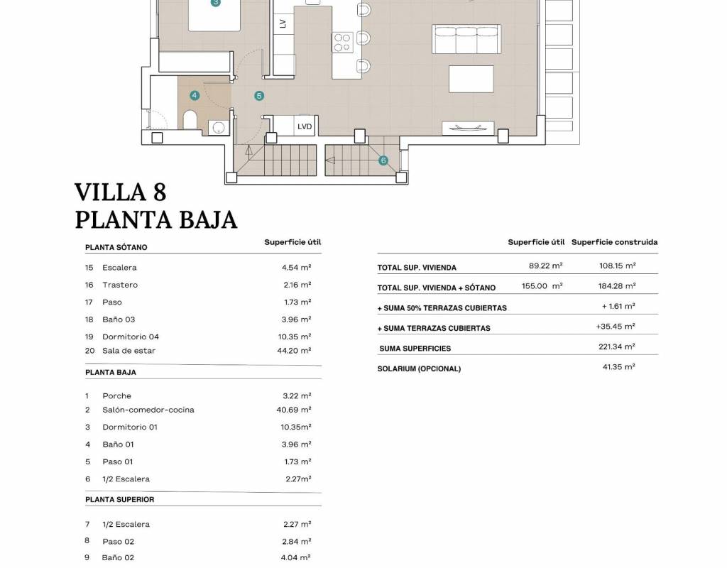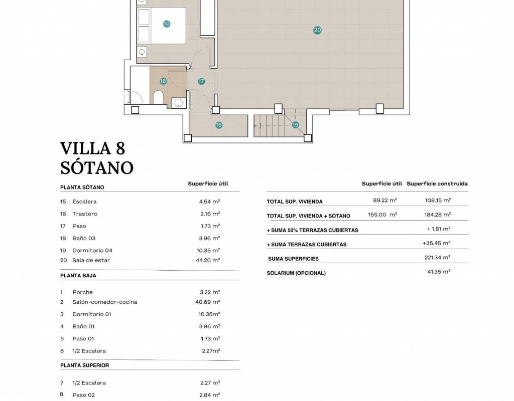 Cada villa está construida en una parcela privada de 432 m², y ofrece la posibilidad de elegir entre distribuciones de una o dos plantas, con la opción de añadir un sótano para disponer de espacio adicional. Todas las viviendas incluyen: