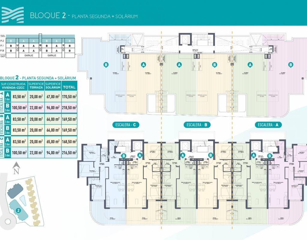 Los bloques de apartamentos ofrecen viviendas de 2 o 3 dormitorios, disponibles en plantas bajas y medias con amplias terrazas o como áticos con soláriums privados. Cada apartamento incluye acceso a un jardín comunitario de estilo mediterráneo y a una gran piscina, perfectos para relajarse y socializar bajo el sol. Las plazas de aparcamiento en un garaje subterráneo y los ascensores en cada bloque añaden comodidad.