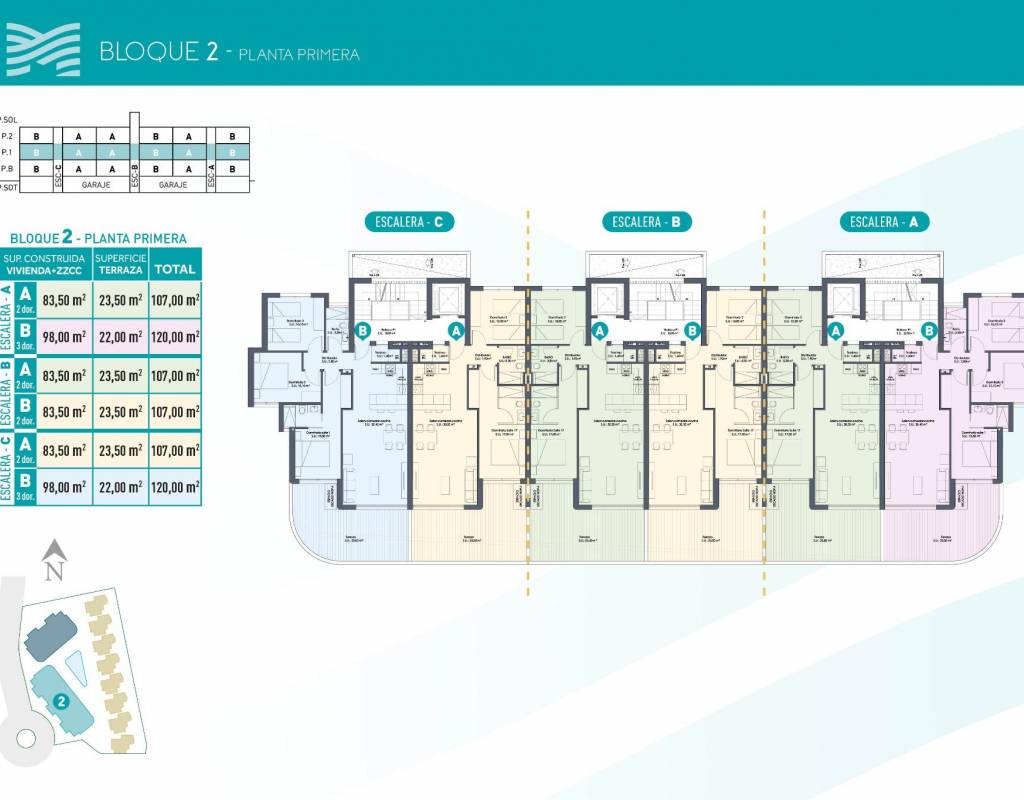 Los bloques de apartamentos ofrecen viviendas de 2 o 3 dormitorios, disponibles en plantas bajas y medias con amplias terrazas o como áticos con soláriums privados. Cada apartamento incluye acceso a un jardín comunitario de estilo mediterráneo y a una gran piscina, perfectos para relajarse y socializar bajo el sol. Las plazas de aparcamiento en un garaje subterráneo y los ascensores en cada bloque añaden comodidad.