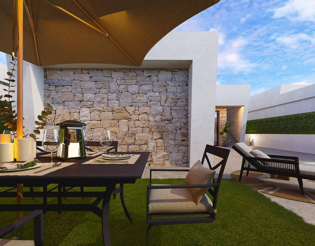 Las villas están cuidadosamente diseñadas para combinar funcionalidad y estética, con fachadas revestidas de piedra en ángulo, acabados elegantes y mucho espacio exterior para disfrutar del sol mediterráneo durante todo el año.