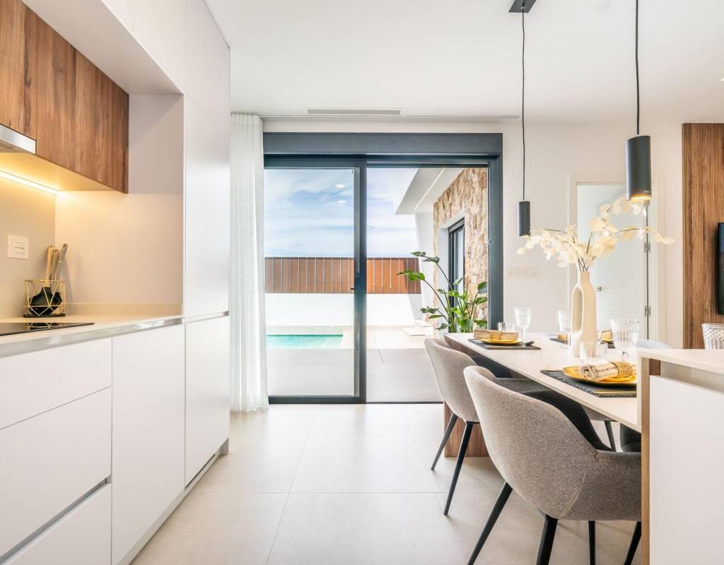 Estas villas de 3 dormitorios y 2 baños, de nueva construcción, situadas en Roldán, Torre-Pacheco, ofrecen un diseño contemporáneo y ecológico, pensado para el confort y el estilo de vida. Construidas en una sola planta, cada vivienda cuenta con un amplio salón-comedor diáfano con una cocina moderna totalmente equipada, que se comunica a la perfección con amplias terrazas y un solárium en la azotea.