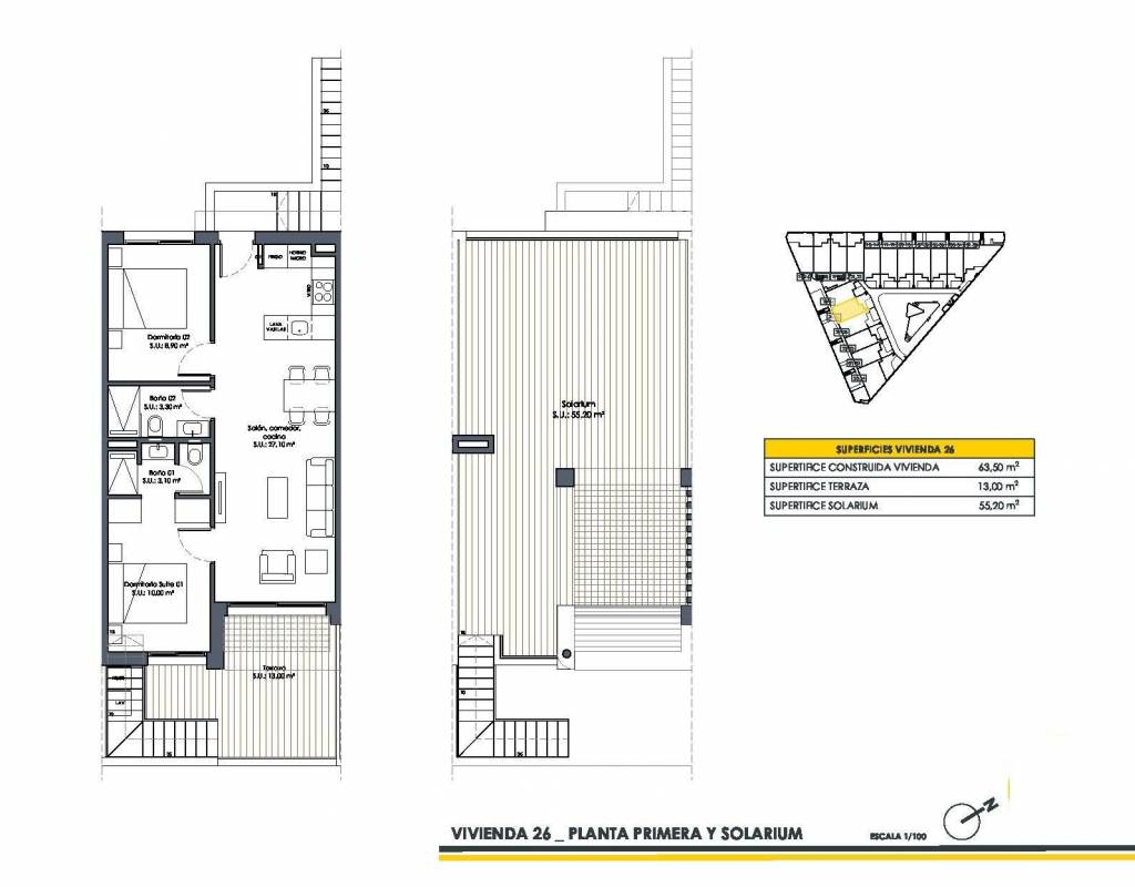 Áticos con solarium privado, pérgolas, tomas de corriente y tomas de agua.