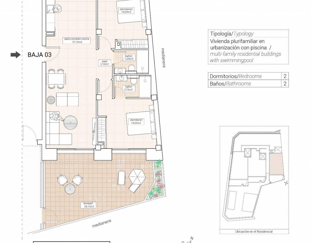 Además, el residencial cuenta con una piscina comunitaria, perfecta para disfrutar del clima mediterráneo.