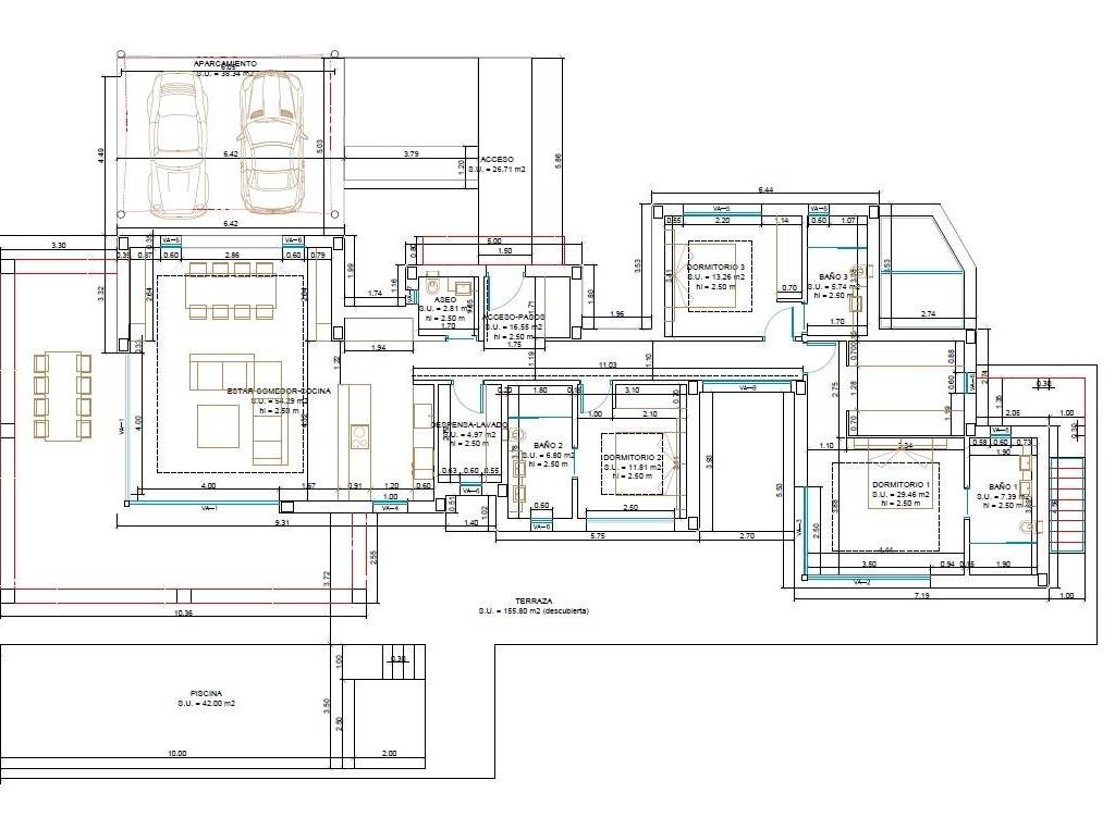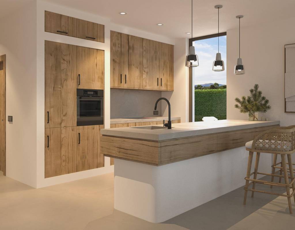 En el interior, la villa ofrece un salón-comedor amplio y luminoso con acceso directo a las terrazas exteriores y a la piscina orientada al sur, lo que permite disfrutar de la luz del sol durante todo el día. La moderna cocina abierta está totalmente equipada y se complementa con un lavadero contiguo y un aseo para invitados.