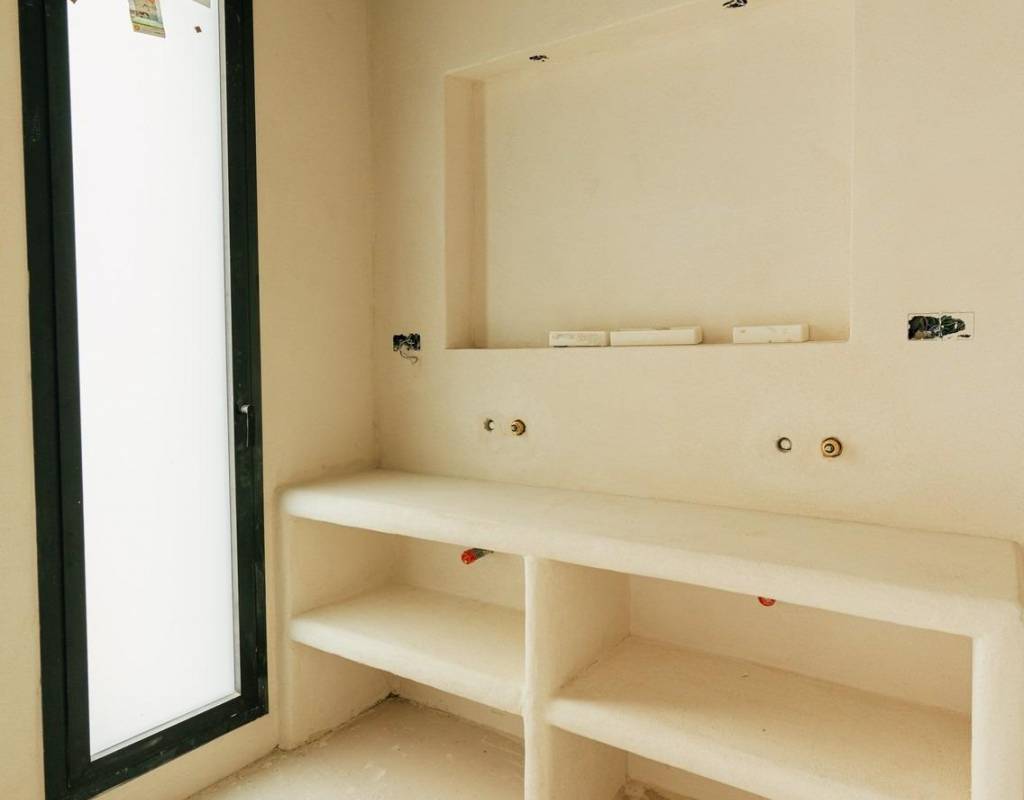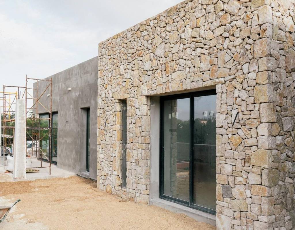 La villa destaca por su fachada blanca, sus esquinas redondeadas y los detalles en piedra del Montgó tallados a mano, que le aportan calidez y autenticidad. Los acabados de alta calidad, como los suelos de microcemento, las ventanas de aluminio con doble acristalamiento en colores óxido y los grifos negros en los baños, contribuyen a crear un ambiente refinado y contemporáneo. Todas las habitaciones están equipadas con persianas eléctricas exteriores para garantizar el confort y la privacidad.