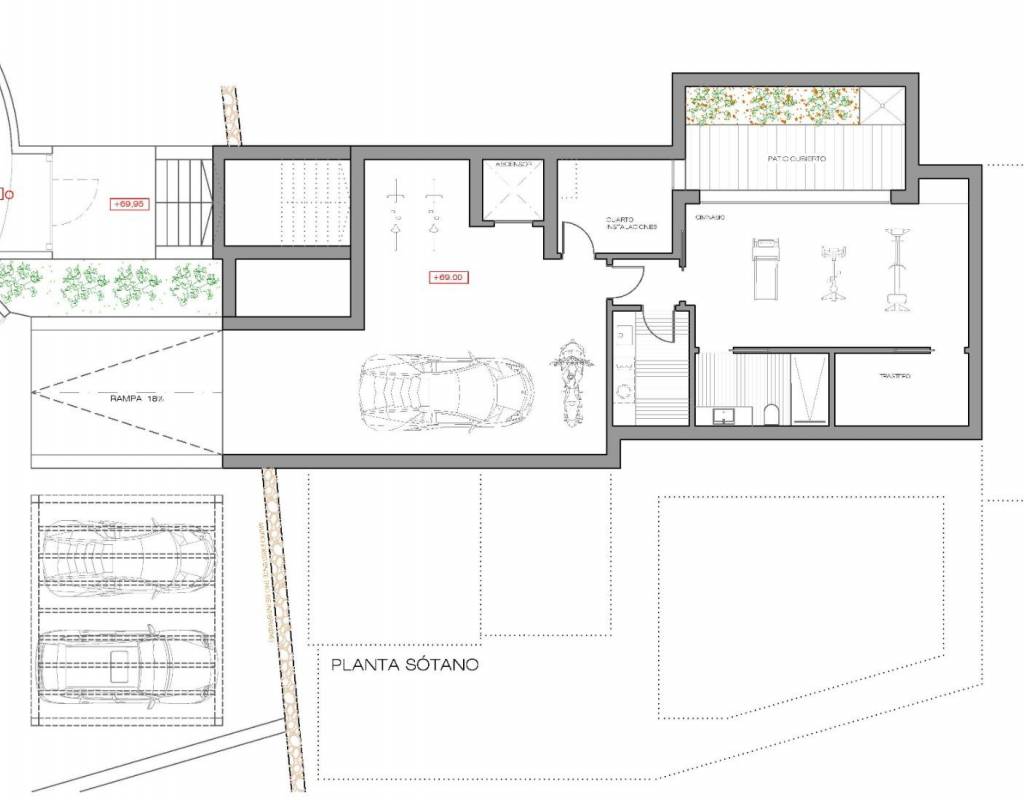 El sótano combina funcionalidad y lujo, con un garaje abierto, ascensor, lavadero, gimnasio, patio cubierto, cuarto de baño y una amplia zona de almacenamiento. Esta planta ha sido diseñada para adaptarse a las necesidades de la vida moderna y ofrecer la máxima comodidad.