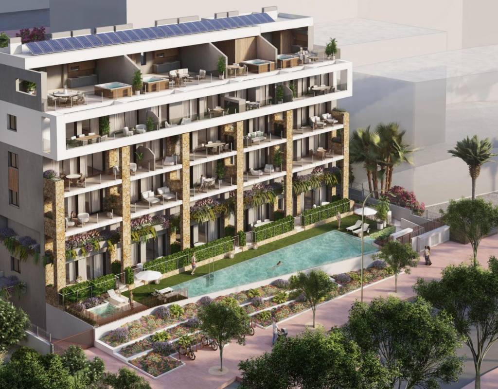 Esta promoción boutique ofrece apartamentos de 1 y 2 dormitorios con amplias terrazas, jardines privados en las plantas bajas o soláriums en los áticos. Cada vivienda está diseñada con un estilo mediterráneo moderno, que combina materiales naturales, colores suaves y líneas arquitectónicas limpias que se integran a la perfección con el entorno costero.
