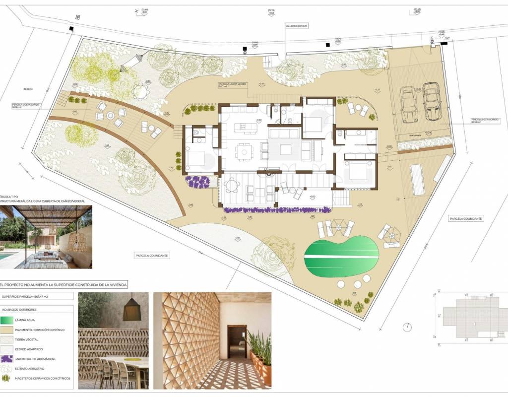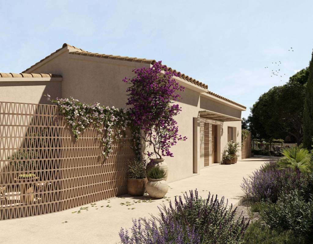 La casa, de una sola planta, ofrece 3 dormitorios con 3 baños en suite y 1 aseo de invitados. Una cocina-salón diáfana da acceso a un porche cubierto y a amplias terrazas abiertas dentro de una parcela de 860 m2 con piscina privada y aparcamiento con espacio para 2 coches.