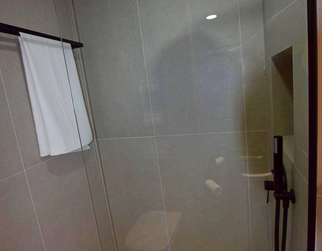 Cuartos de baño totalmente equipados con mueble de lavabo, inodoro suspendido, espejo, ducha mural, mamparas de ducha y calefacción radiante en el suelo.