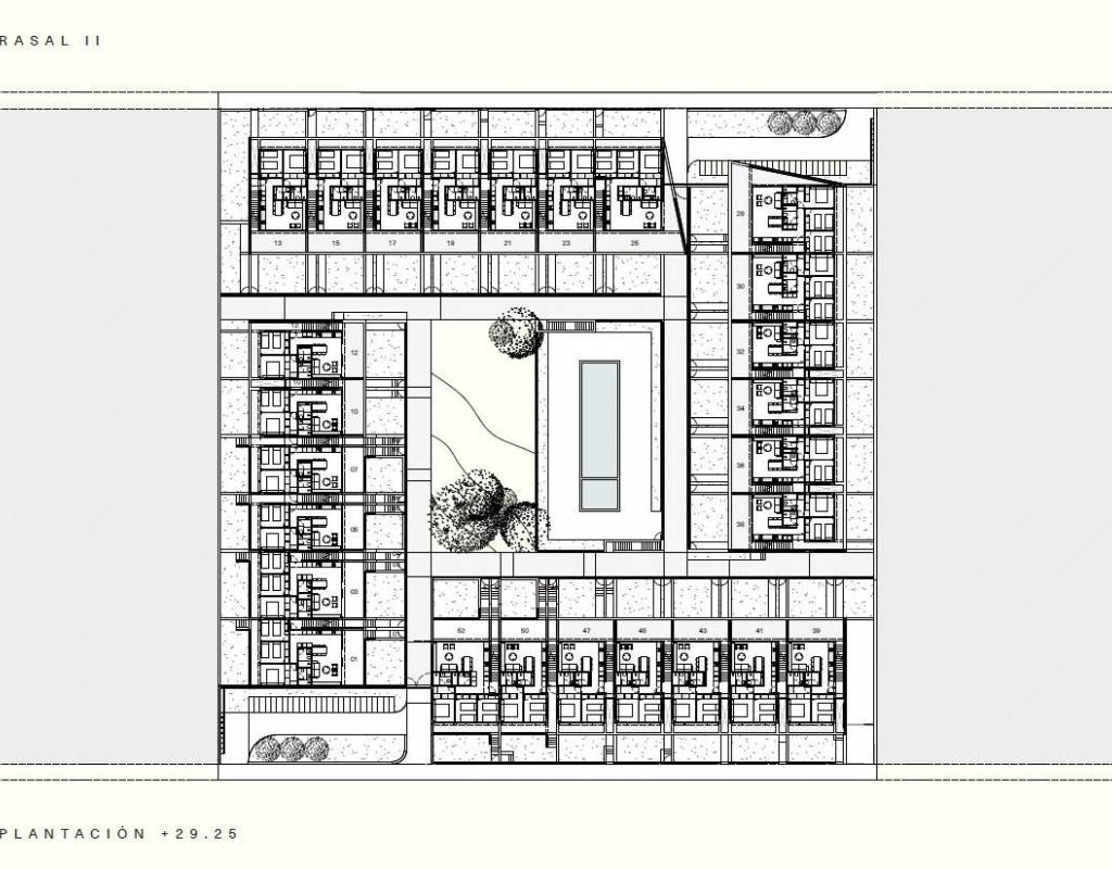 El proyecto se distribuye en cuatro bloques que rodean una gran zona común central. Este corazón verde de la urbanización cuenta con una piscina con zona infantil y unos jardines con un bonito diseño paisajístico. Estos espacios compartidos son perfectos para relajarse, socializar y pasar tiempo en familia en un entorno seguro y agradable.