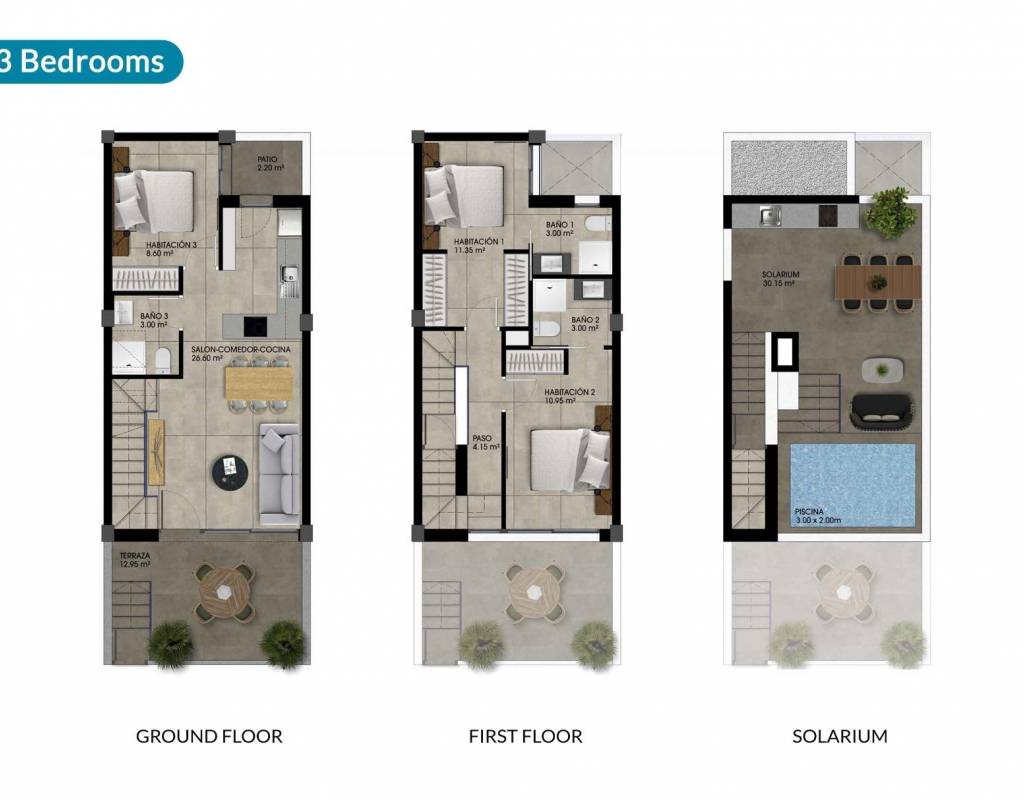 Cada vivienda se distribuye en tres plantas, incluido un solárium privado, que ofrece impresionantes vistas abiertas y un espacio ideal para relajarse. Los interiores cuentan con iluminación LED integrada, acabados contemporáneos y una distribución de concepto abierto que potencia la luz natural.