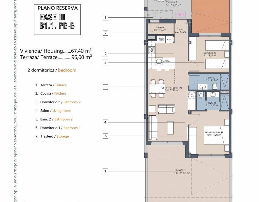 La promoción consta de 29 viviendas modernas de 2 o 3 dormitorios, diseñadas con líneas arquitectónicas limpias y acabados de alta calidad. Los compradores pueden elegir entre apartamentos en planta baja con jardín y terraza privados, viviendas en plantas intermedias con amplias terrazas o áticos con terraza privada y solárium en la azotea con vistas panorámicas. Muchas de las propiedades disfrutan de vistas al campo de golf Serena y al Mar Menor, lo que crea un entorno tranquilo y agradable.