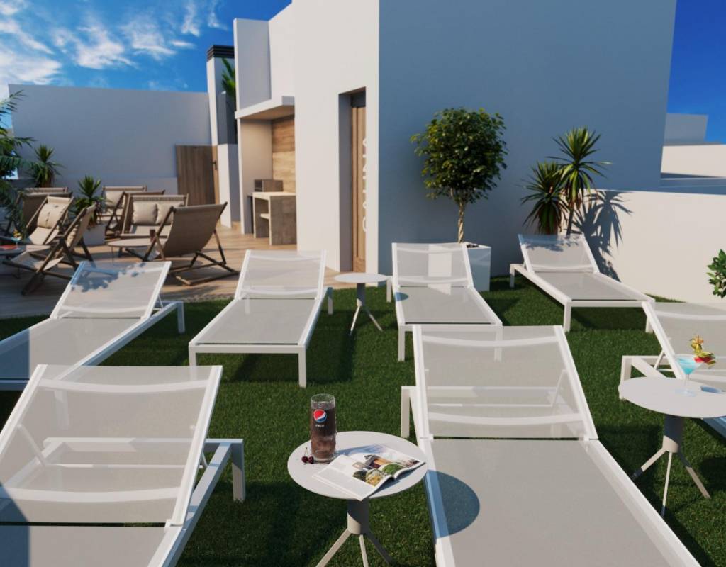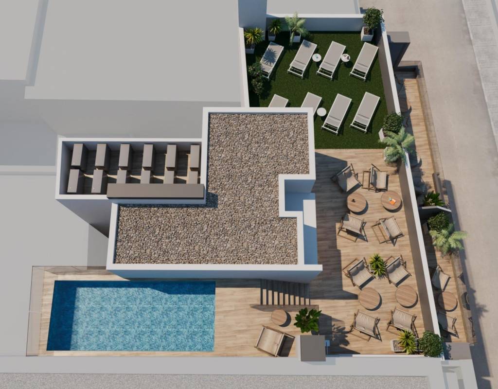Los residentes pueden disfrutar de un solárium exclusivo en la azotea con piscina comunitaria, barbacoa, sauna y zona de solarium con tumbonas, accesible por ascensor o escaleras. Esta zona privada es perfecta para relajarse, tomar el sol y disfrutar de las vistas panorámicas de la ciudad. Ofrece un refugio tranquilo sobre las animadas calles de Torrevieja y añade un valor significativo a la promoción.