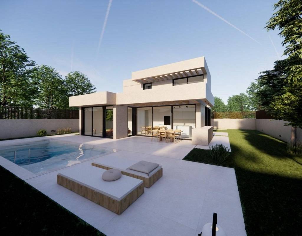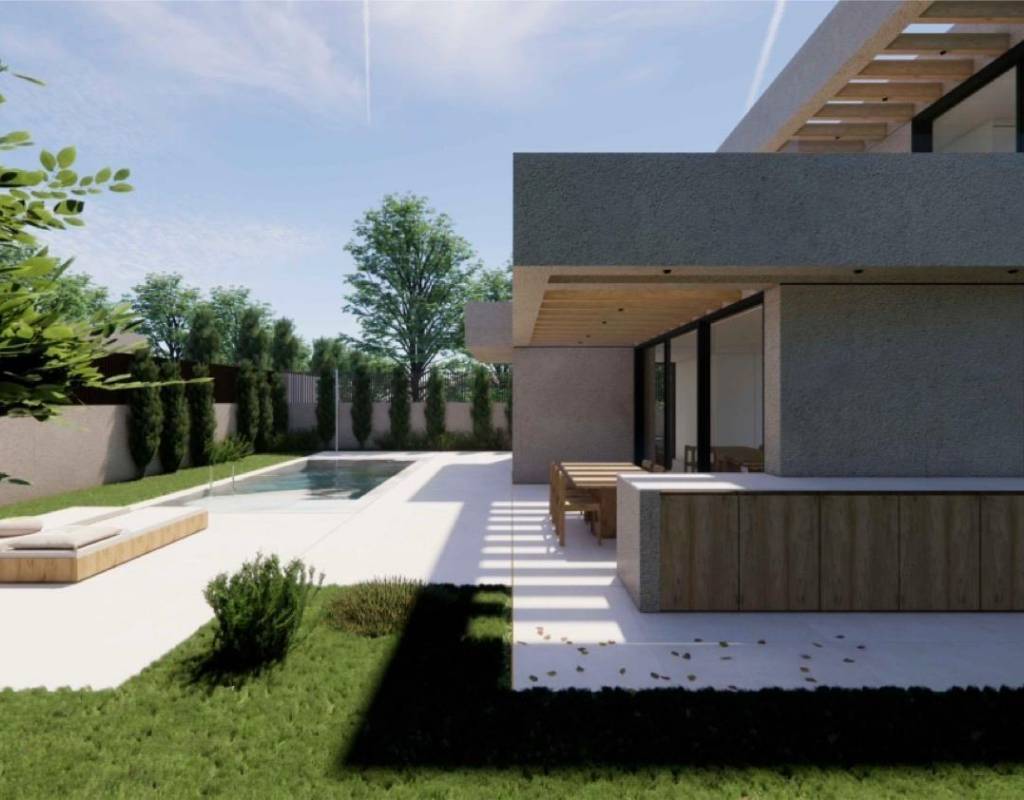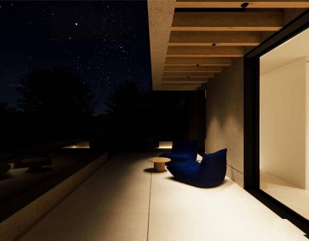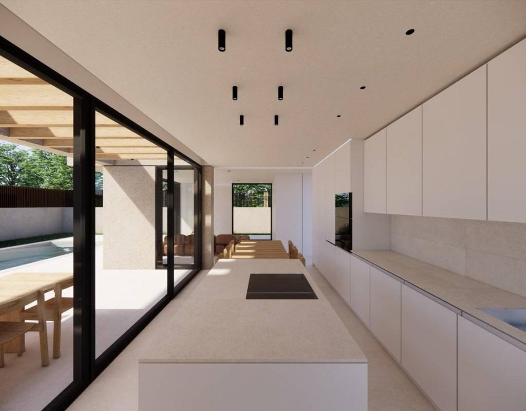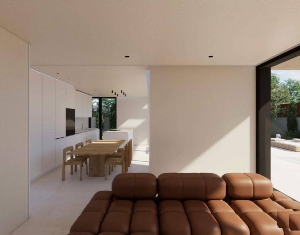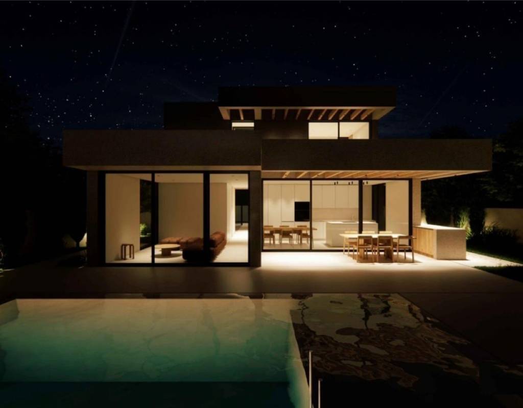 La planta principal le da la bienvenida con un vestíbulo de entrada con armario empotrado y aseo para invitados. Este nivel incluye un dormitorio en suite con puertas ventanas elevables de suelo a techo que dan a una terraza lateral privada. La luminosa sala de estar y comedor de planta abierta conecta directamente con una terraza cubierta con pérgola y la piscina privada de agua salada, creando un armonioso estilo de vida interior y exterior.