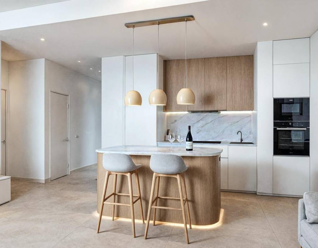 Los interiores están diseñados con zonas de estar diáfanas, que combinan la cocina, el comedor y el salón para maximizar la luz natural y crear una fluidez perfecta en toda la vivienda.