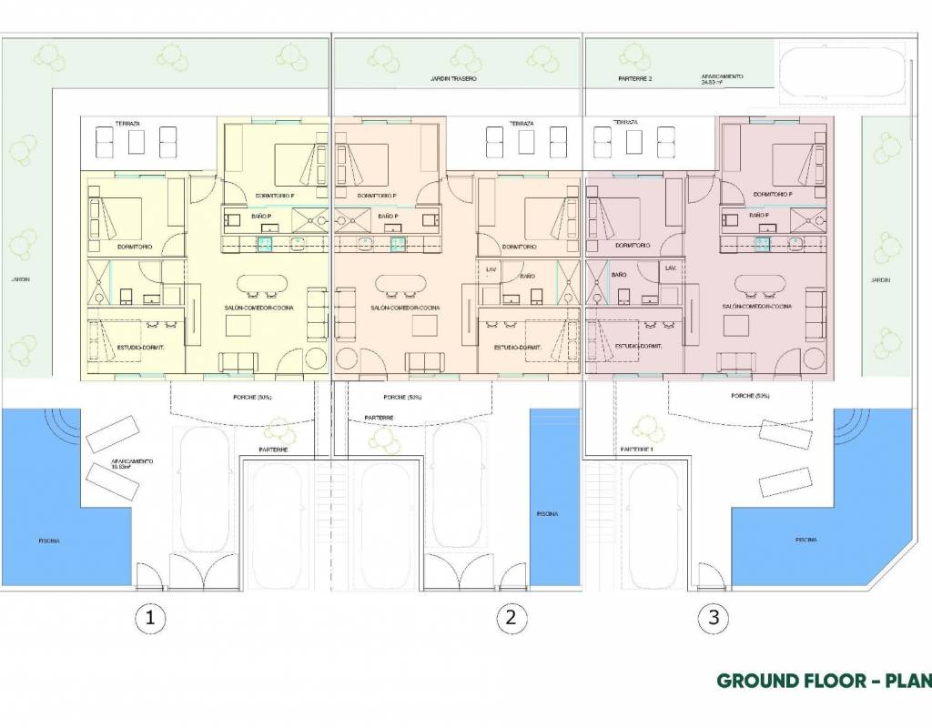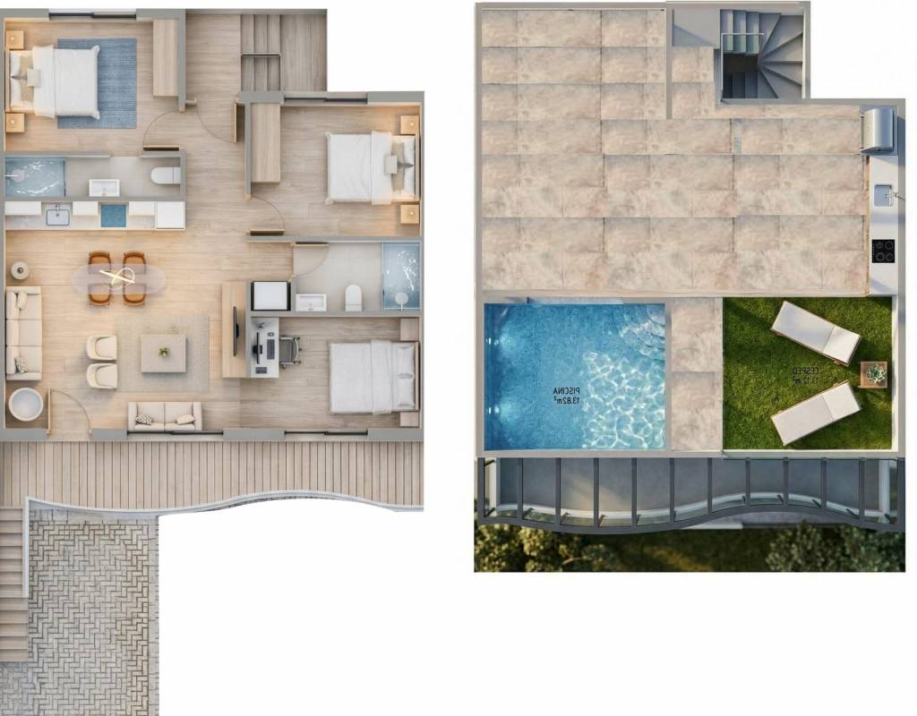 Los bungalows de planta baja incluyen jardín privado, piscina privada y plaza de aparcamiento en la parcela, ideales para quienes buscan espacio y fácil acceso. Las viviendas de la planta superior ofrecen una terraza privada y un solárium en la azotea con piscina privada, así como una plaza de aparcamiento asignada a pie de calle.
