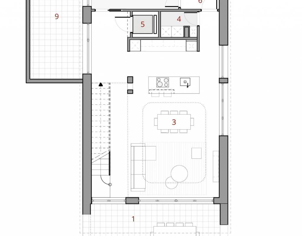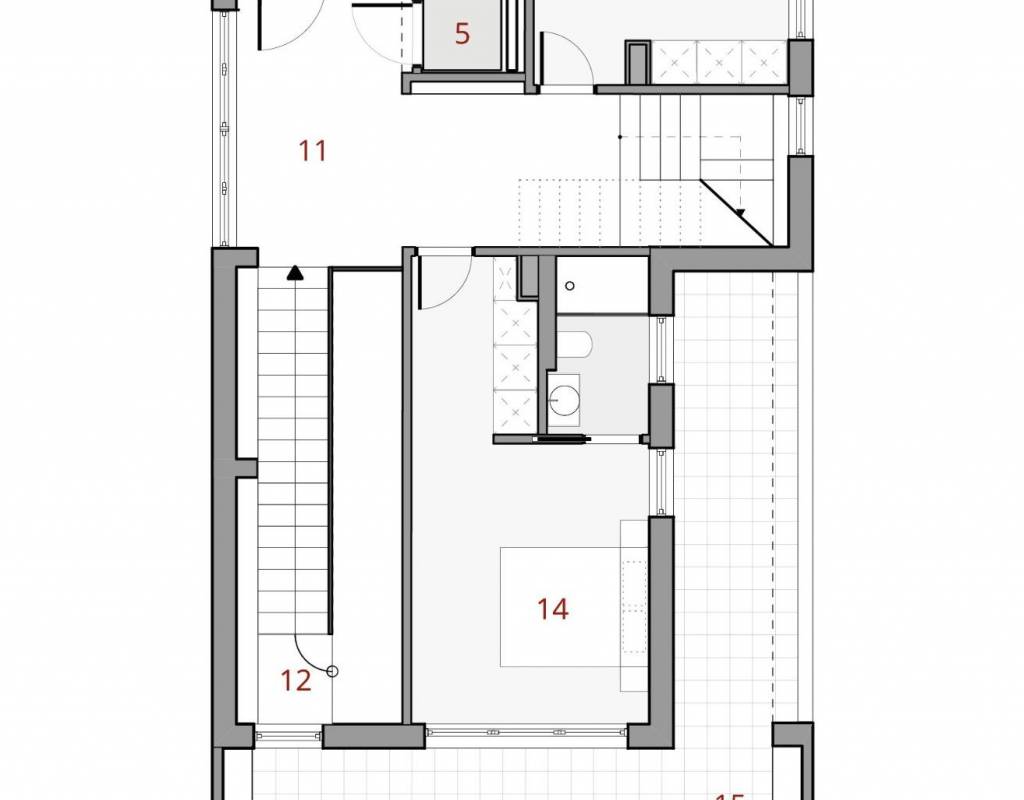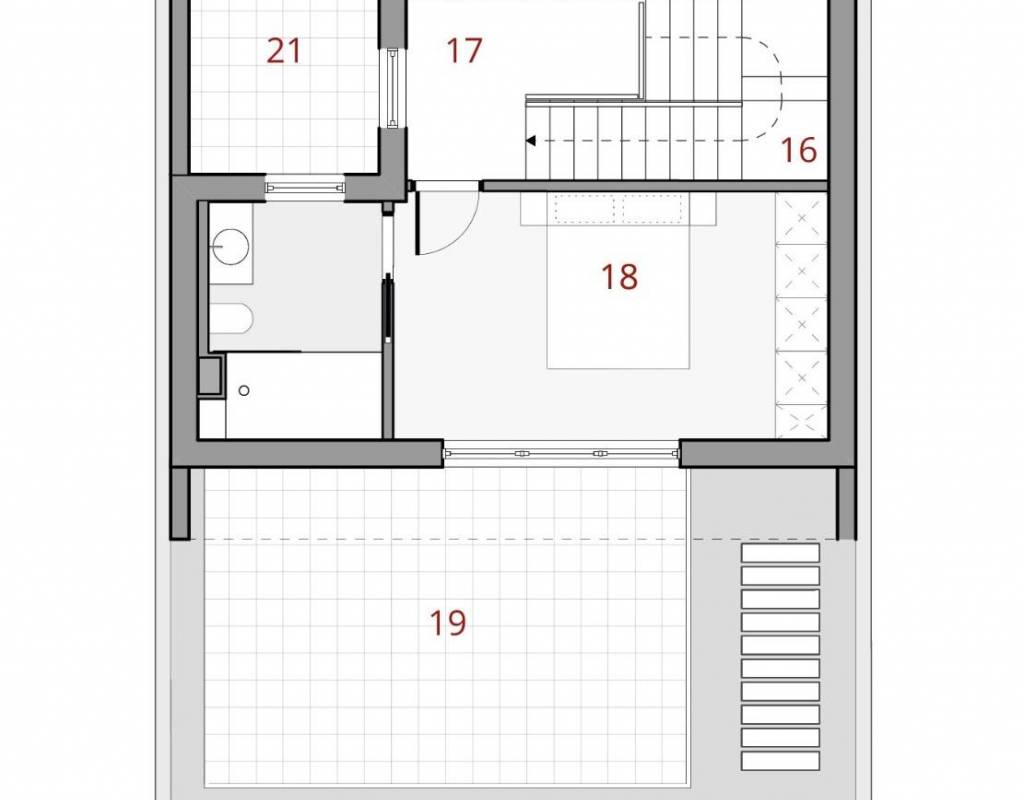 Niveau 2 ten slotte, waar zich de hoofdslaapkamer bevindt, opent naar een ruim terras en is afgewerkt met monolayer met textuur in een warme tint.