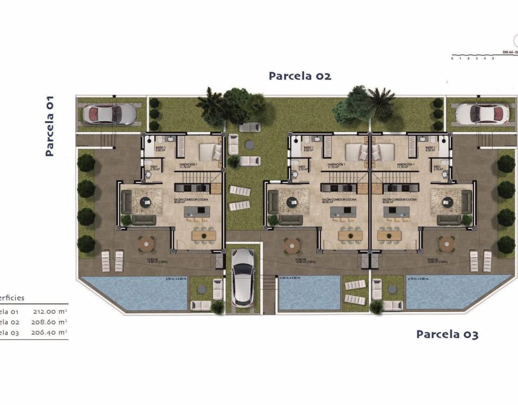 Dankzij het grote perceel hebben de woningen een tuin met een apart zwembad en een parkeerplaats op het perceel.