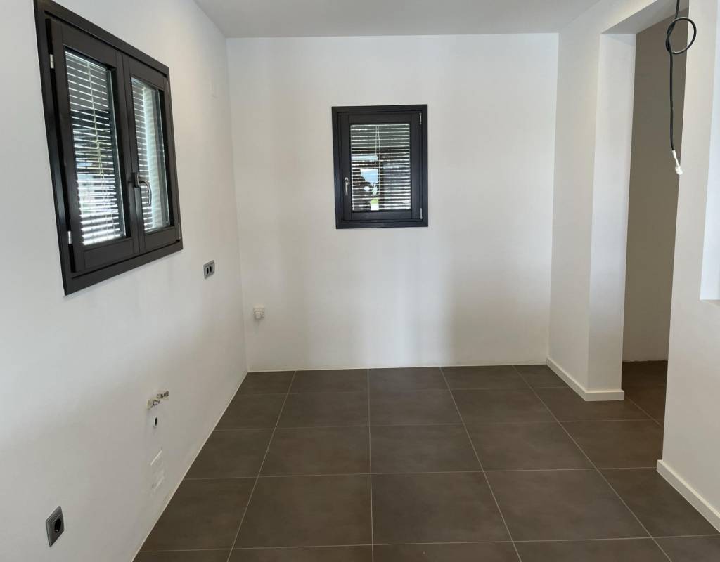 Op de begane grond bevindt zich een lichte woon-eetkamer met open haard, een ruimte die klaar is voor de installatie van een moderne keuken en wasruimte (vooraf geïnstalleerd sanitair en elektriciteit), en een complete badkamer met douche.