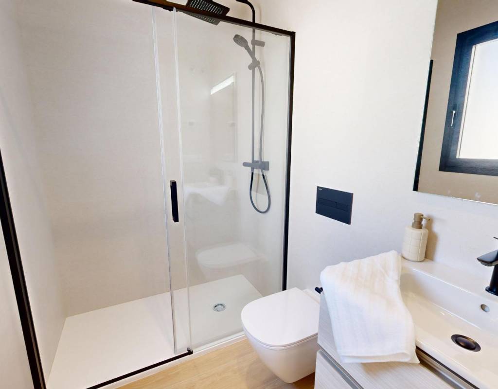 Penthouse-leilighetene har 3 soverom med innebygde garderober, 2 bad (ett ensuite), et åpent kjøkken integrert i stuen og direkte tilgang til en stor terrasse. Hver bolig har også et privat solarium på taket med bod, perfekt for å nyte solen hele dagen. Parkering er tilgjengelig i en nærliggende bygning.