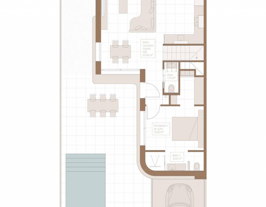 Første etasje har stue og spisestue med åpen kjøkkenløsning, direkte tilgang til hagen, et soverom med eget bad og walk-in-garderobe, gjestetoalett og privat parkeringsplass på tomten. Et privat basseng kan legges til mot en ekstra kostnad.