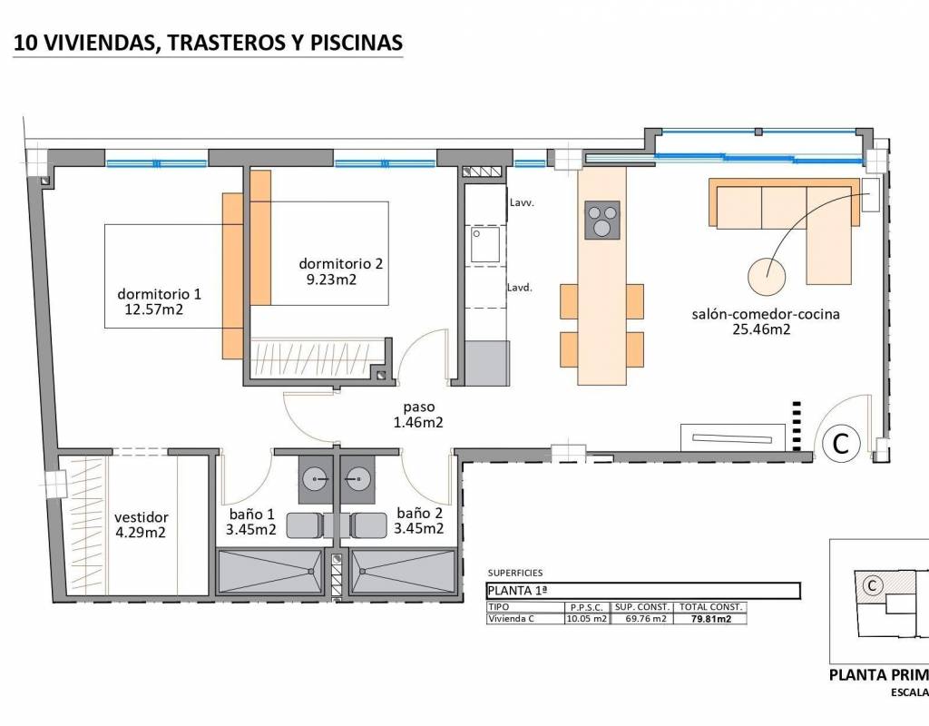 Prosjektet tilbyr romslige leiligheter med to soverom og to bad, inkludert et hovedsoverom med eget bad. Alle boligene har åpen kjøkkenløsning som er koblet til lyse oppholdsrom, noe som skaper funksjonelle og innbydende rom. Høydepunktet i prosjektet er en eksklusiv penthouse med tre soverom og tre bad, med en stor terrasse, et privat solarium på taket og eget svømmebasseng, som tilbyr en eksepsjonell livsstil med privatliv og åpen utsikt.