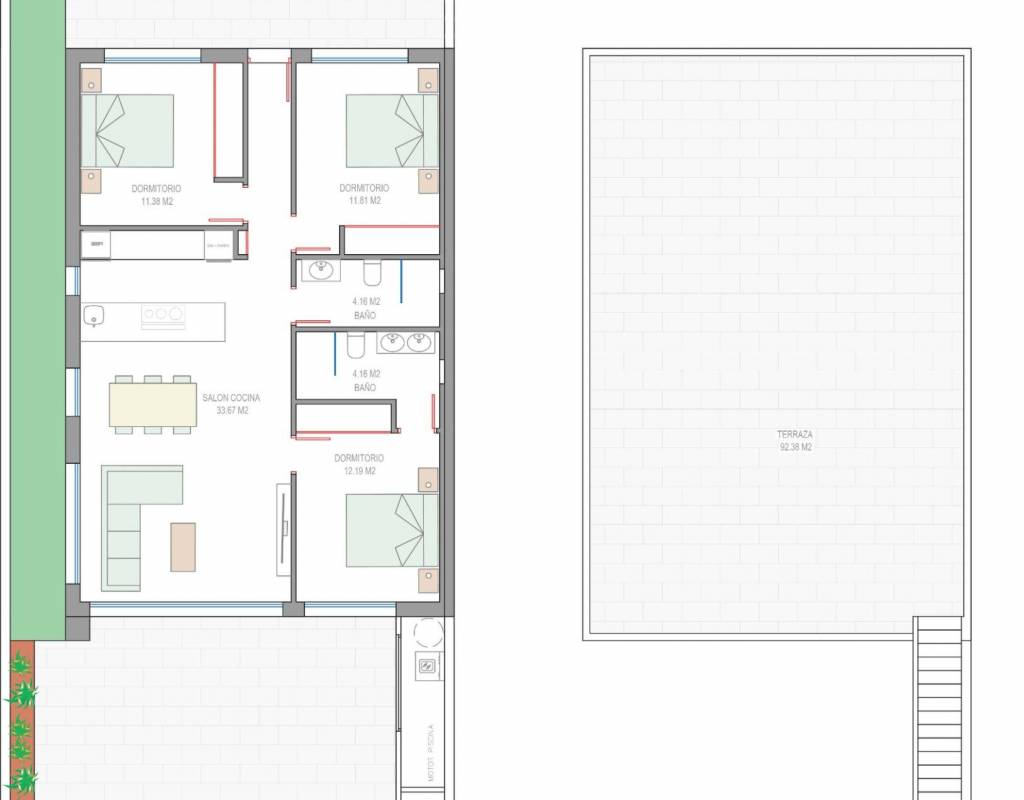 Utbyggingen består av stilige villaer med 3 soverom og 2 bad, tilgjengelig i to forskjellige størrelser på henholdsvis ca. 106 kvm og 130 kvm. Den største modellen har også et ekstra gjestetoalett. Alle villaene er designet i én etasje, noe som gir praktisk og komfortabel boform. Det åpne kjøkkenet, spisestuen og stuen har direkte tilgang til en terrasse og privat hage med svømmebasseng, noe som skaper et ideelt rom for innendørs og utendørs opphold. Hver eiendom har også et privat solarium og parkering på tomten.