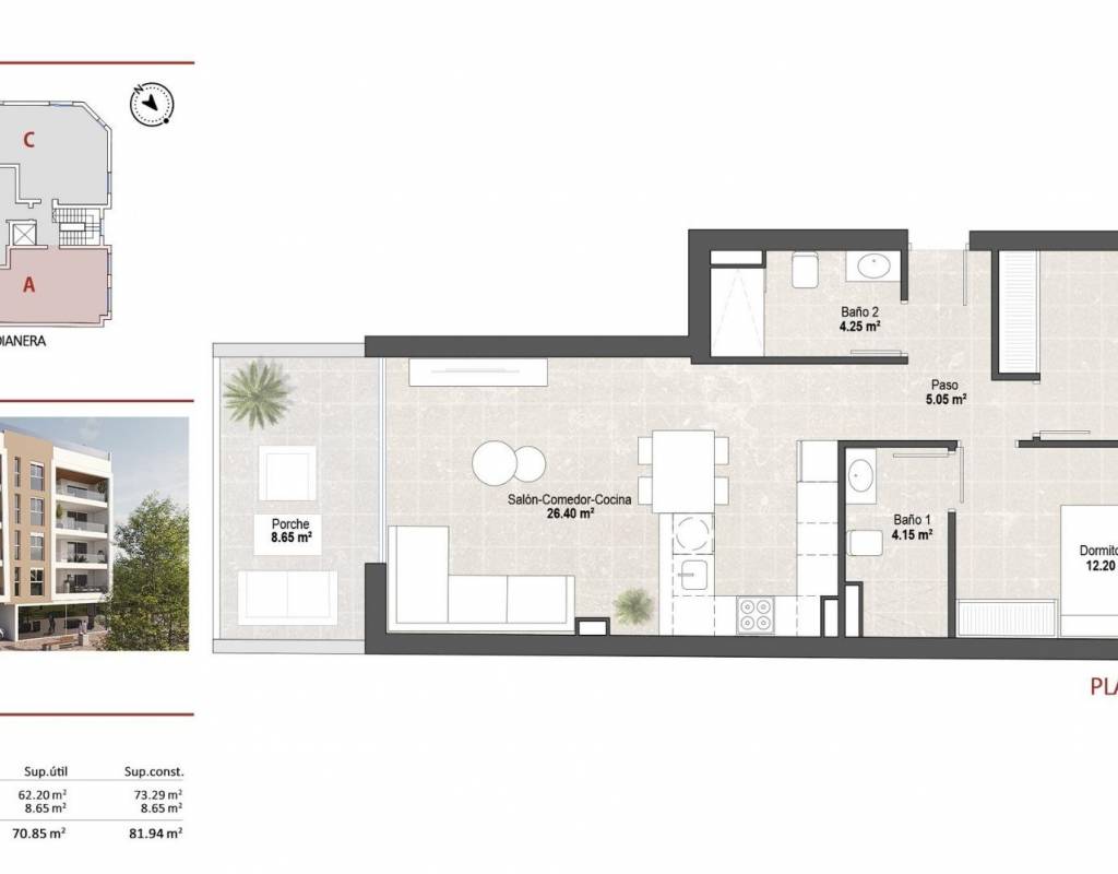 Prosjektet tilbyr leiligheter med enten 1 soverom og 1 bad eller 2 soverom og 2 bad, hvorav det ene er en suite. Hver eiendom har en privat terrasse på ca. 9 m2 og en lys åpen planløsning hvor det fullt utstyrte kjøkkenet med hvitevarer går sømløst over i stuen.