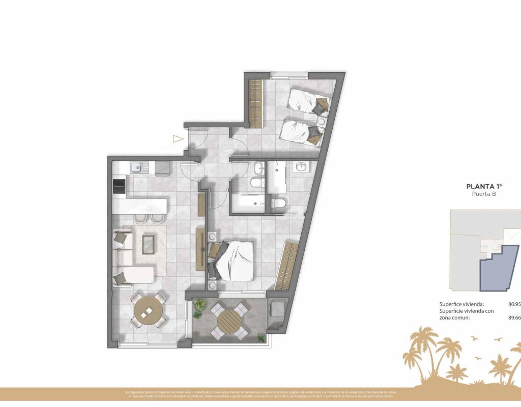 Dette moderne boligkomplekset består av leiligheter med 2 og 3 soverom og 2 bad (inkludert ett en-suite). Kjøpere kan velge mellom leiligheter i første etasje med terrasse og uteplass, leiligheter i mellomste etasje med terrasse eller penthouse-leiligheter med privat solarium, ideelt for å nyte solen og havbrisen hele året.