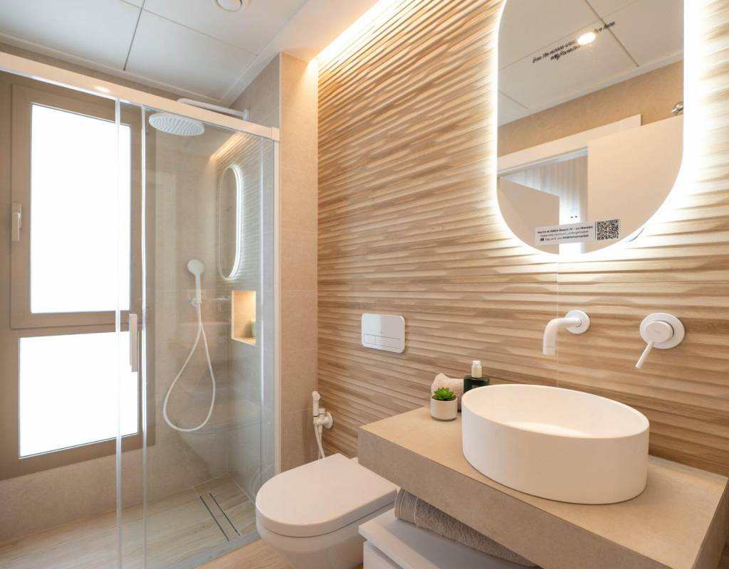 Bad med bakbelyste speil, dusjvegger og servantskap