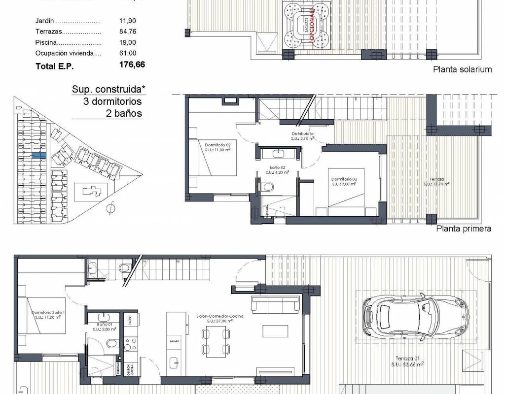 Hver eiendom har en privat tomt med eget svømmebasseng, noe som skaper det perfekte miljøet for å nyte middelhavsklimaet hele året. Boligene har 3 soverom og 2 eller 3 bad pluss gjestetoaletter, og tilbyr komfortable og funksjonelle oppholdsrom som er ideelle for familier eller gjester.