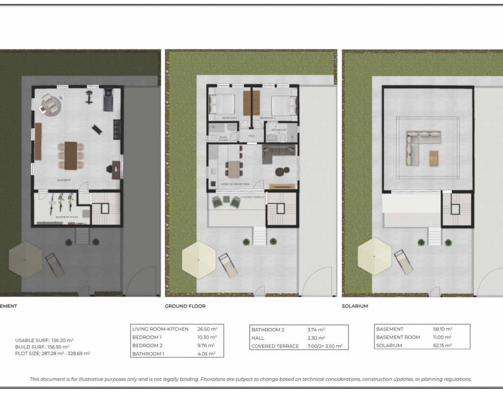 Hver villa ligger på en privat tomt fra 300 m², noe som gir utendørsarealer for avslapning og underholdning. Eiendommene har også et privat solarium, som gir ekstra utendørs oppholdsareal med åpen utsikt over den omkringliggende golfbanen og landskapet.