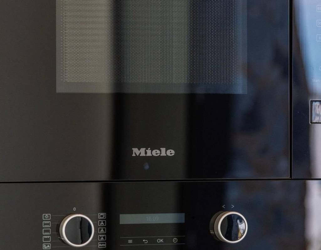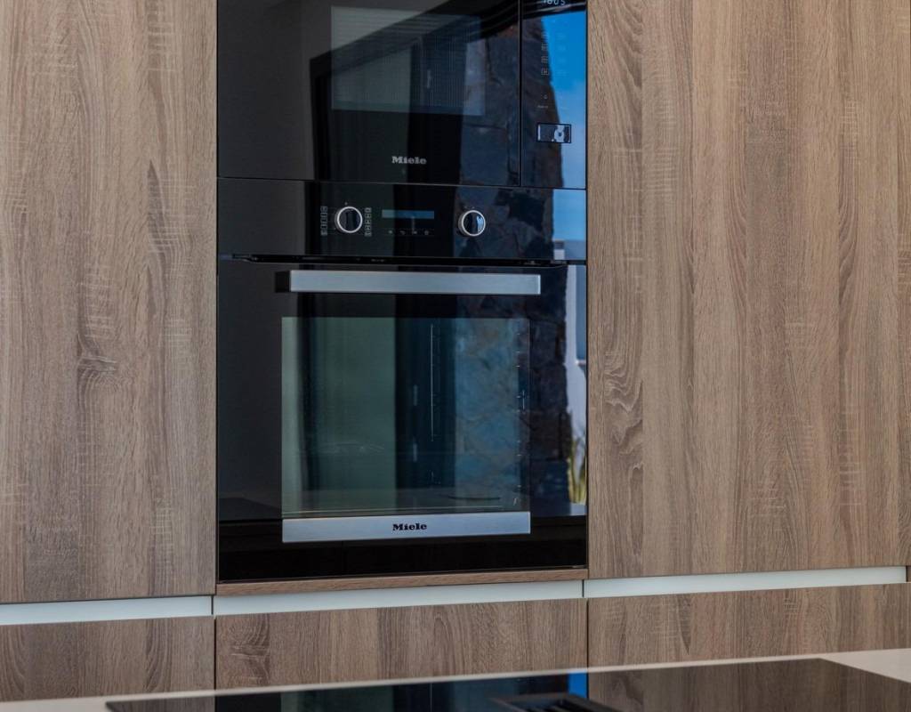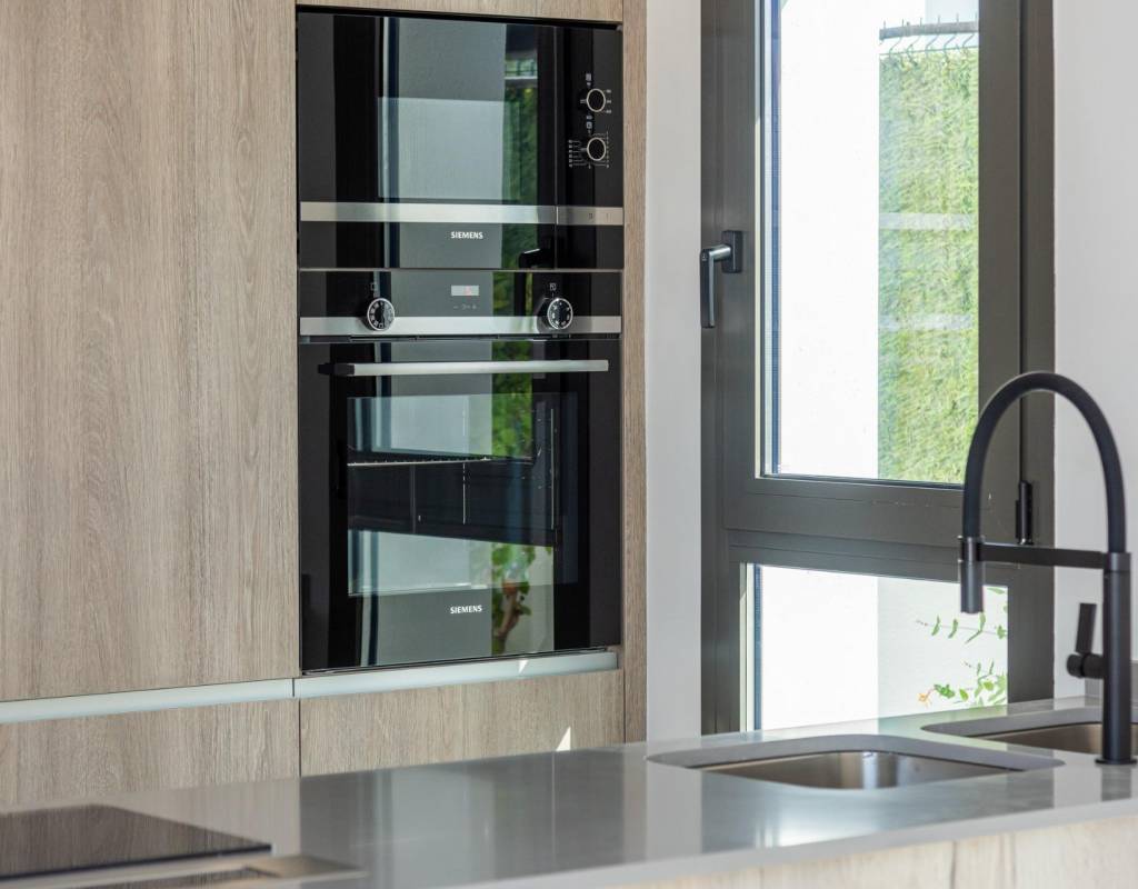 Fully furnished kitchen in white gloss or wood colour includes Induction hob with integrated extractor, oven, microwave, washing machine, integrated refrigerator, and integrated dishwasher.