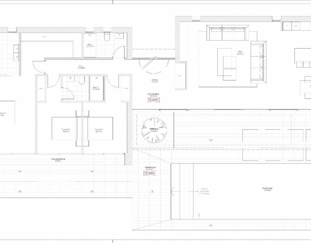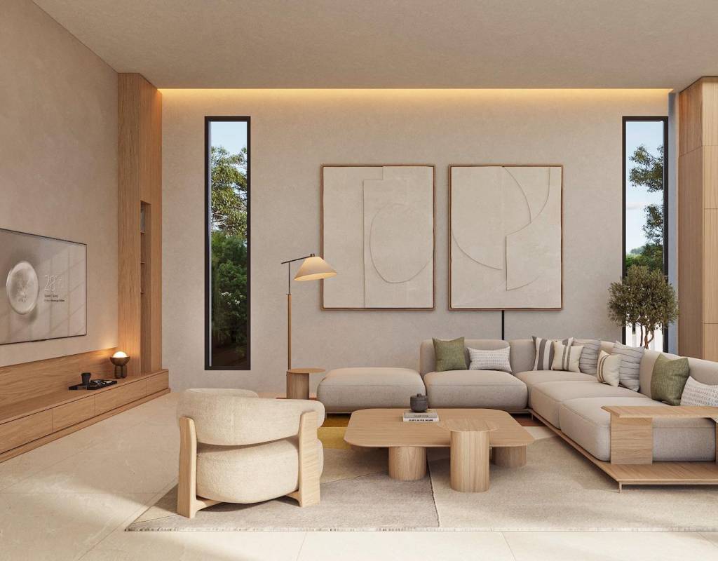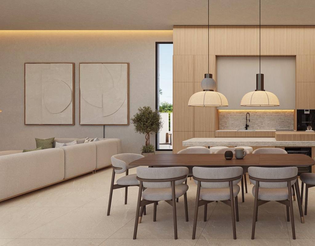 Designed for practicality and ease, the villa is distributed across a single floor, making it ideal for both families and retirees. The entrance leads into a bright hallway, opening up to a spacious open-plan living and dining area with a modern kitchen featuring an island separate utility room. Large sliding doors connect the interior with a covered porch area complete with a built-in barbecue, an expansive terrace, and a private swimming pool of 52 m².
