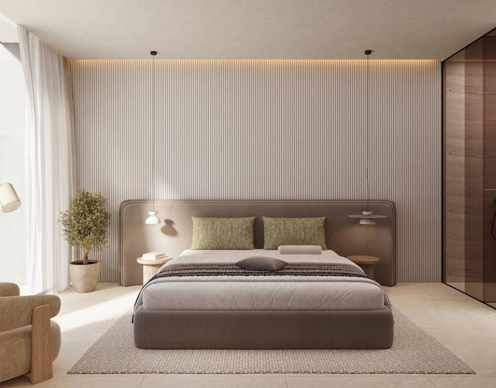 The sleeping area is smartly arranged on the right wing of the home, consisting of:
