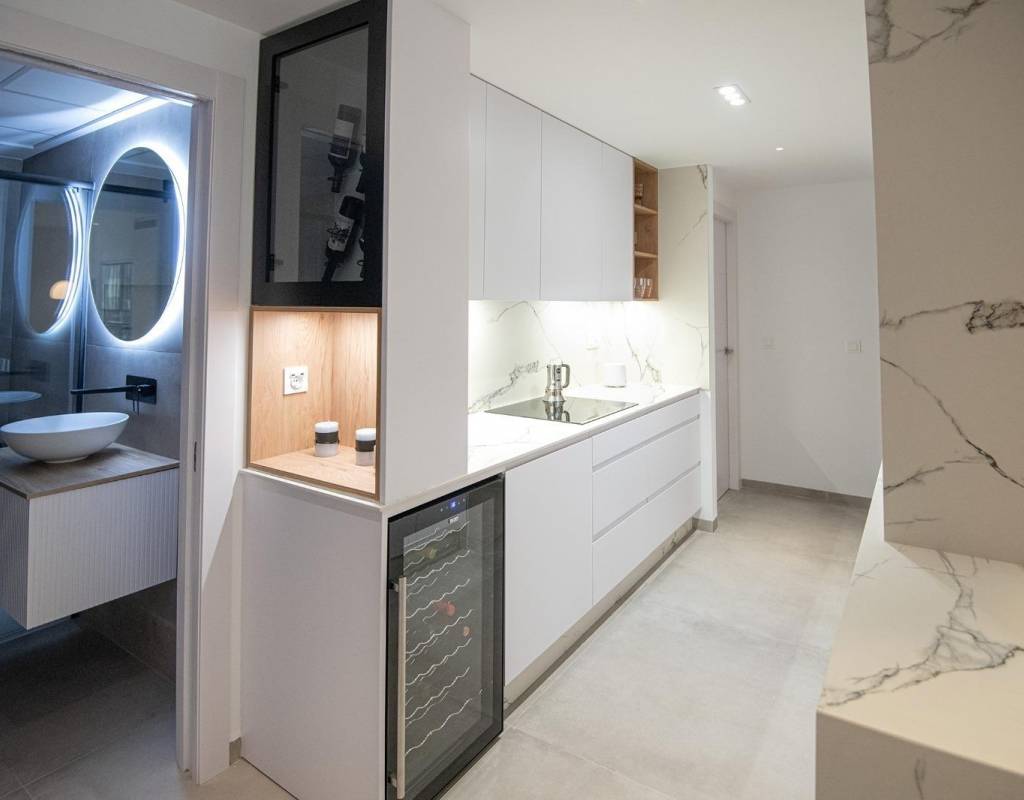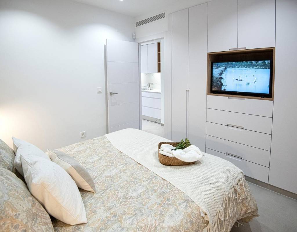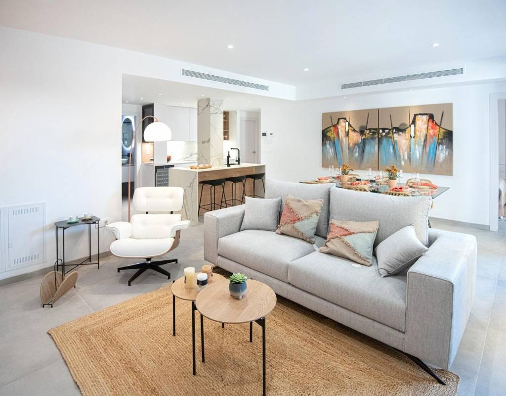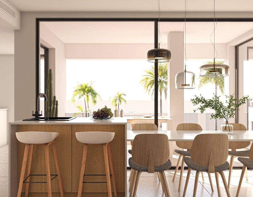 Apartments and penthouses with 2 and 3 bedrooms, 2 bathrooms, with open plan fully equipped kitchen with white goods - Bosch or Siemens, living area, large terraces, fitted wardrobes, fully equipped bathrooms with underfloor heating, aircon, electric shutters, closed storage, parking space with socket 16 Amp for electric cars.
